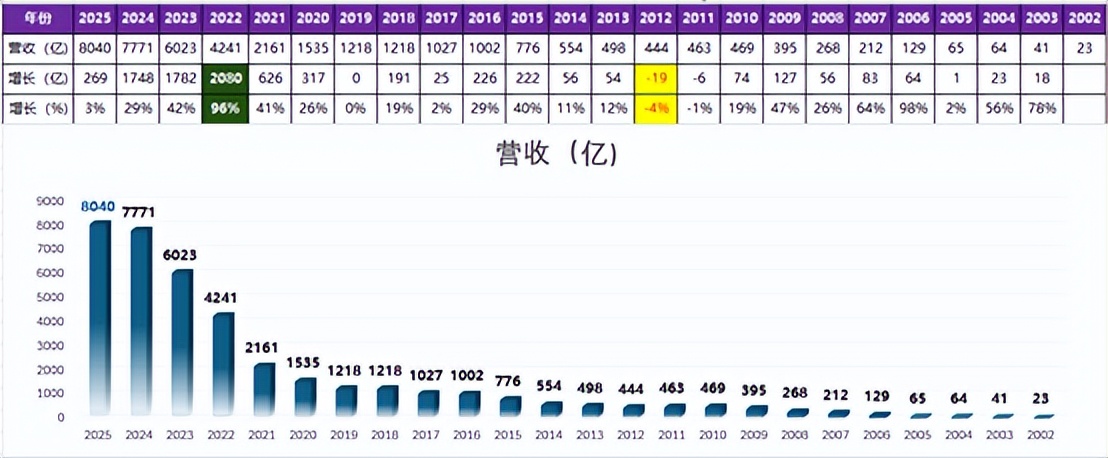 通过梳理比亚迪近23年的营收可以发现,比亚迪在近23年里,其2025年的营收增长至2002年的350倍。