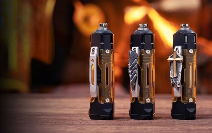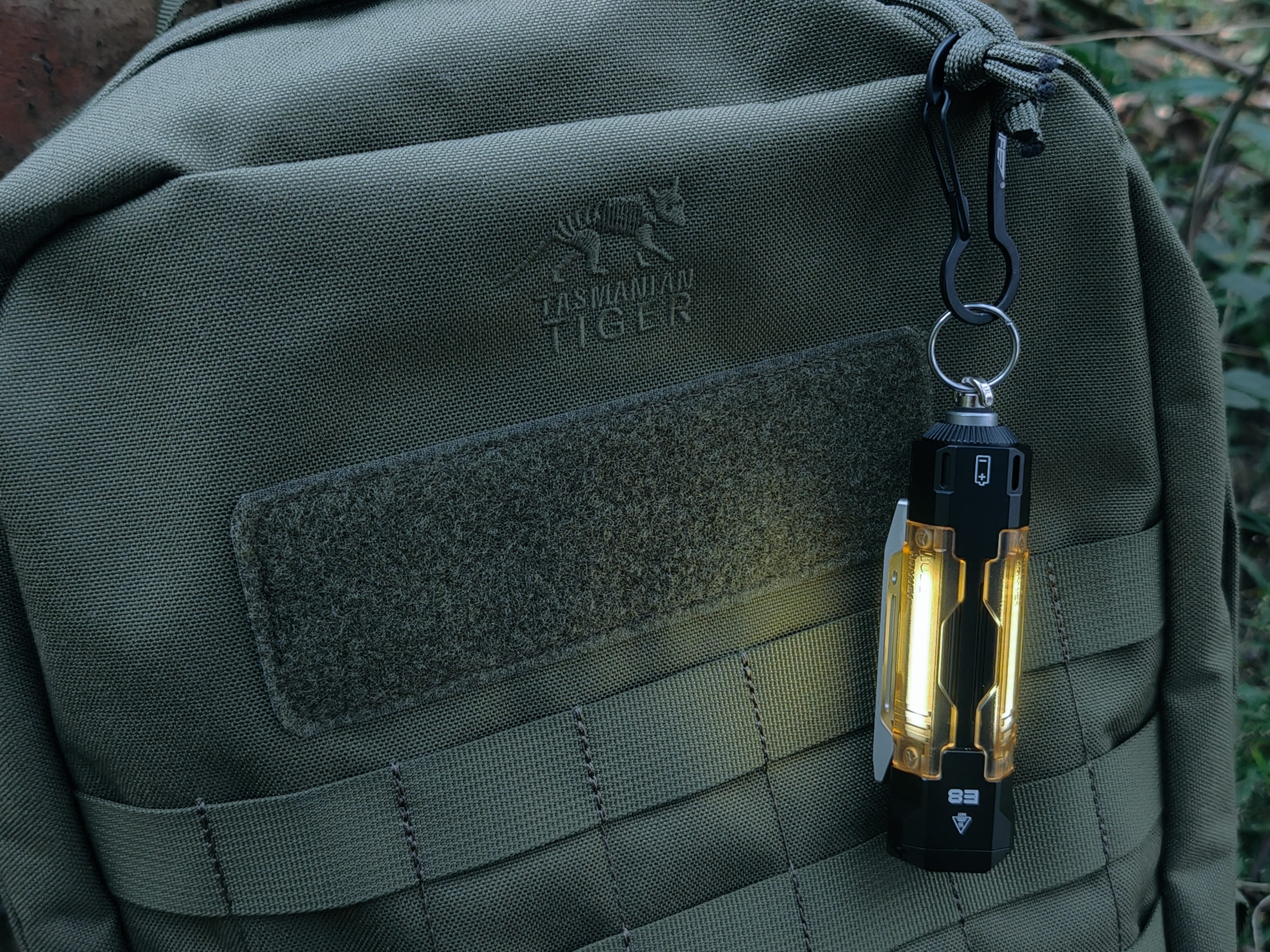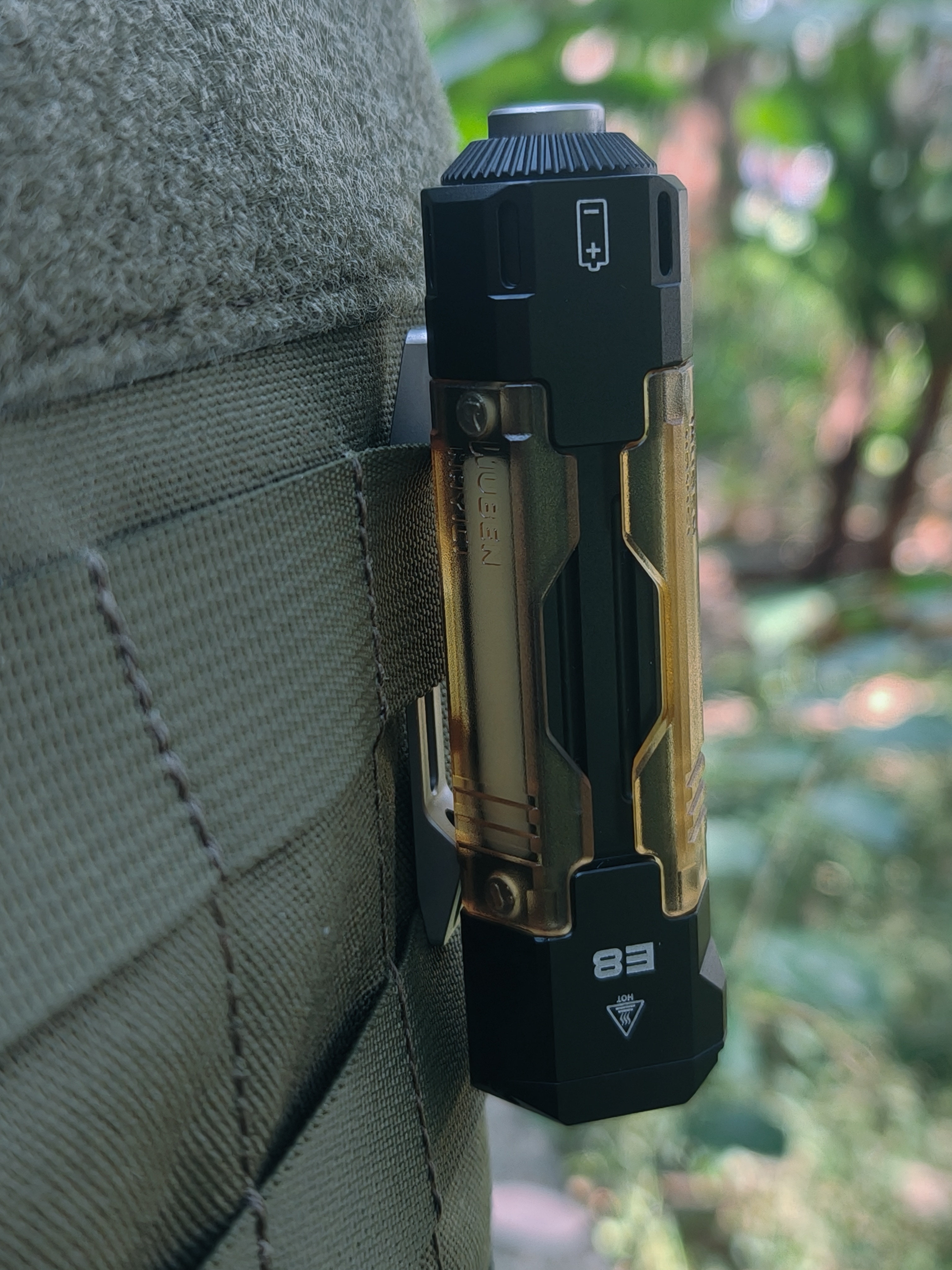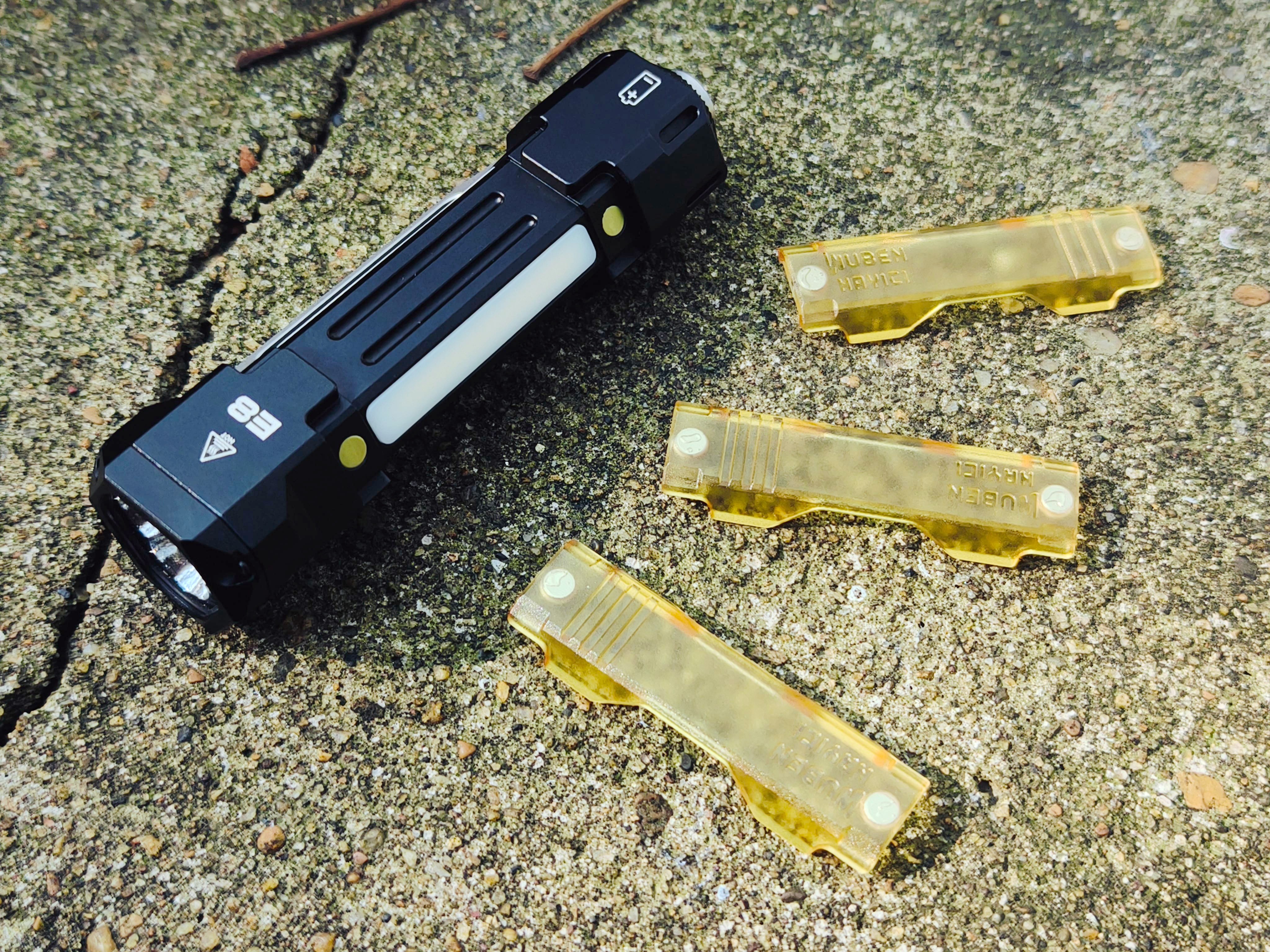 E8的最大特色在于筒身均匀分布了3条竖形灯带,灯带两头有强磁与甲片连接。让整支手电在关闭时也依然具有很强的机能风设计感。