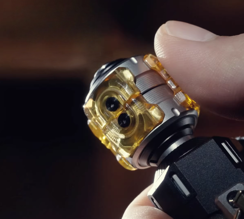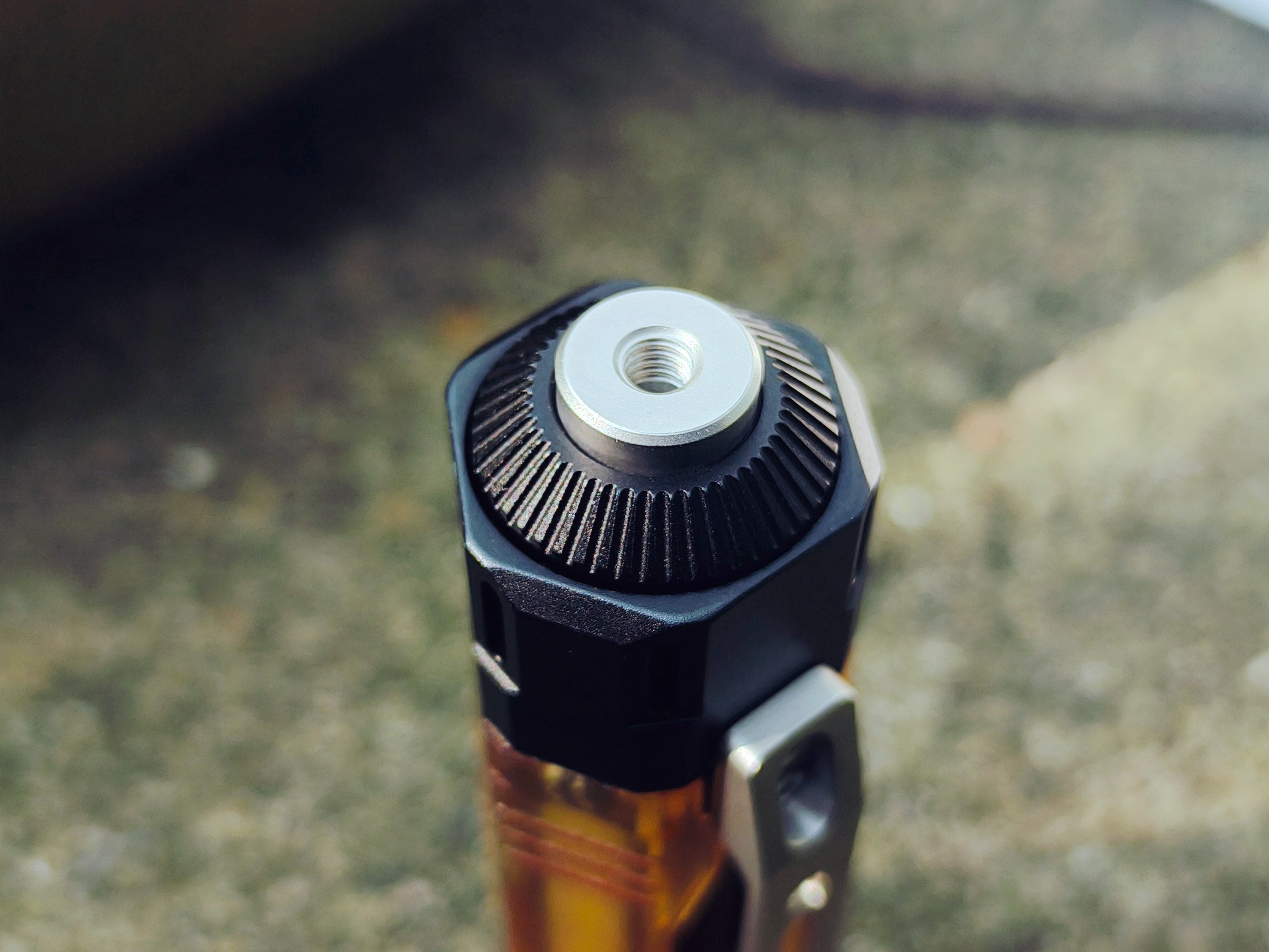 筒尾呈锥形,中间嵌了颗预留有M4螺纹孔的圆柱做按按键。它不仅是开关,也是一整套模块系统的接口,允许增加可拆卸配件,比如挂载装置或装饰配件,可玩性直接拉满。
