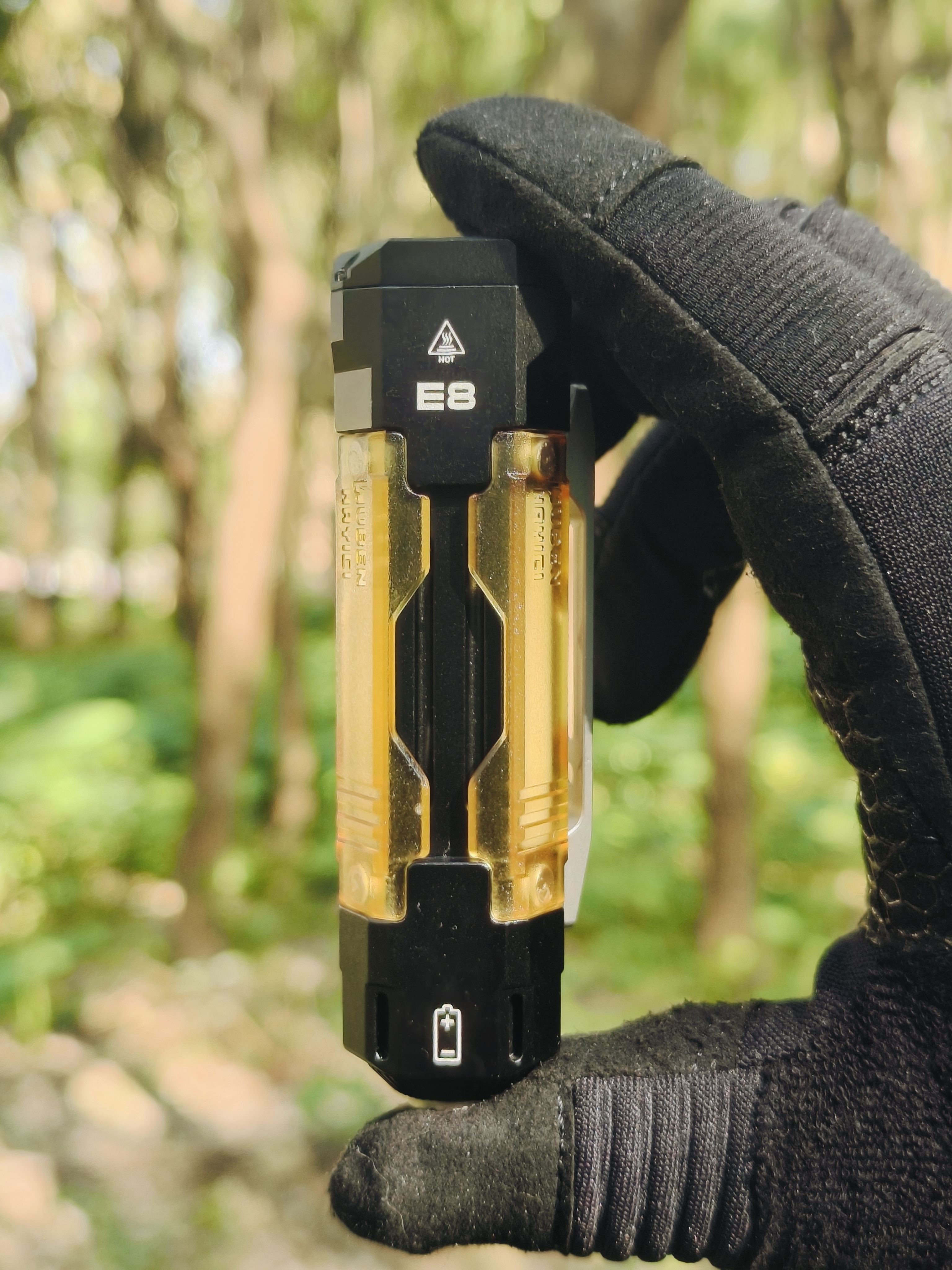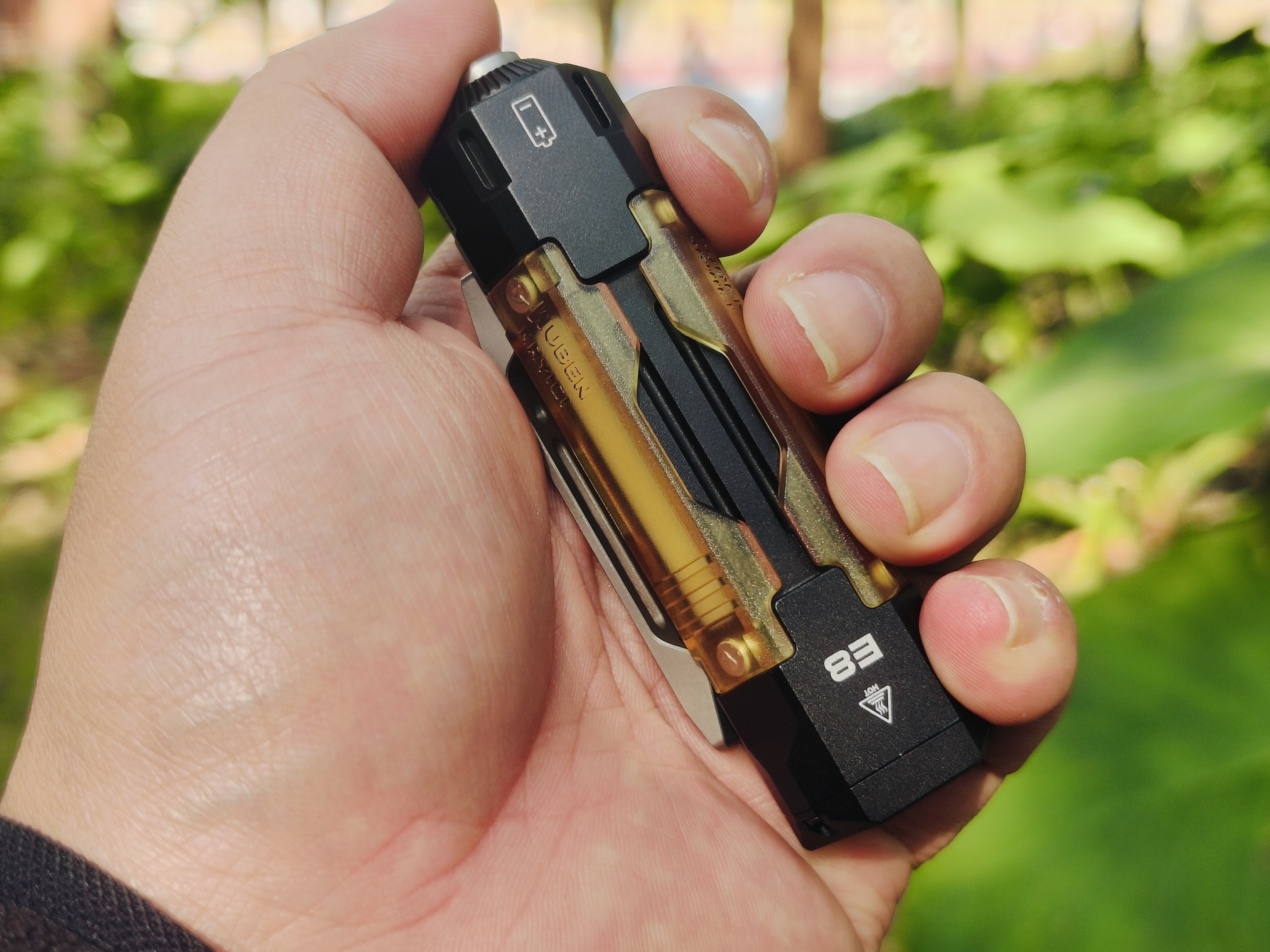 E8作为与南樱旗联名作品,筒尾的螺纹孔不仅兼容尾坠,还可以搭配南樱旗的震荡粒子,把陀螺和手电有机结合,顺手就能把玩。