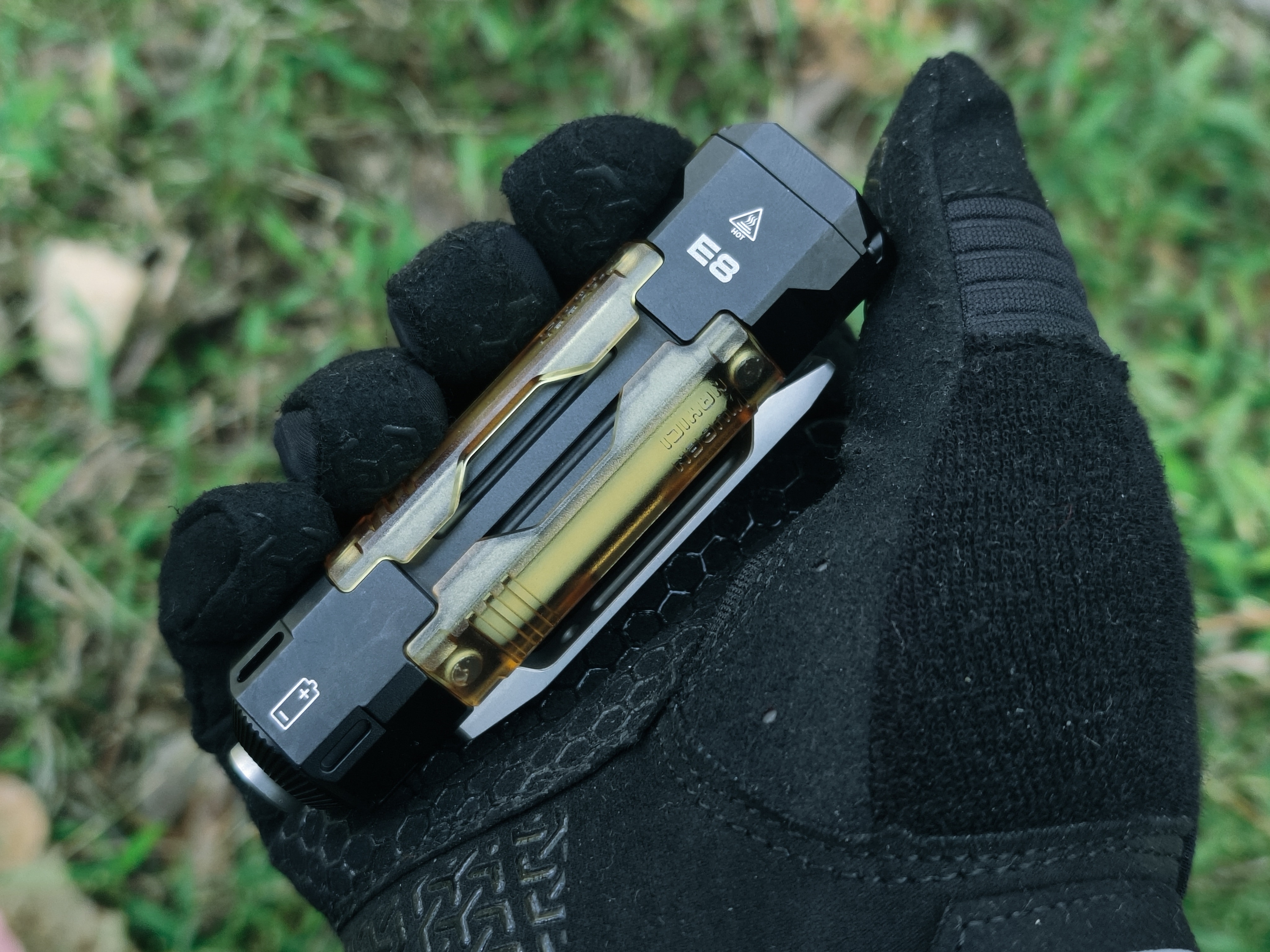 E8的个性化设计远不止一处,筒尾预留的6个氚管孔,可以搭配不同颜色的氚管装饰,氚管的自发光特性使得其能发出微弱荧光,即使装饰也更容易找寻。