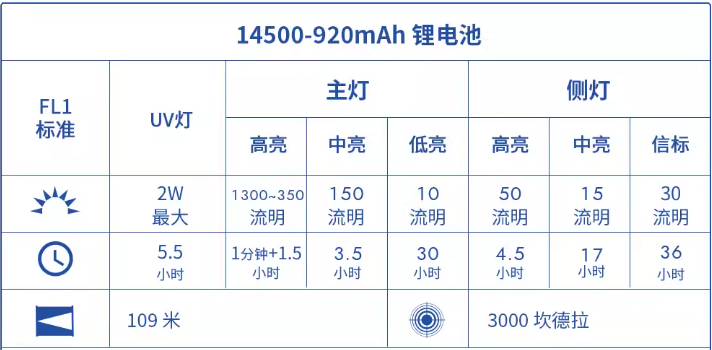 主灯开启后,单击轻触进入低亮(10LM)——中亮(150LM)——高亮(1300LM)——低亮(10LM)档位循环,单击关闭。高亮档持续一分钟后开始降档,稳定在350LM直至电量耗尽,续航时间1.5h,中亮续航时间3.5h,低亮续航可达30h。