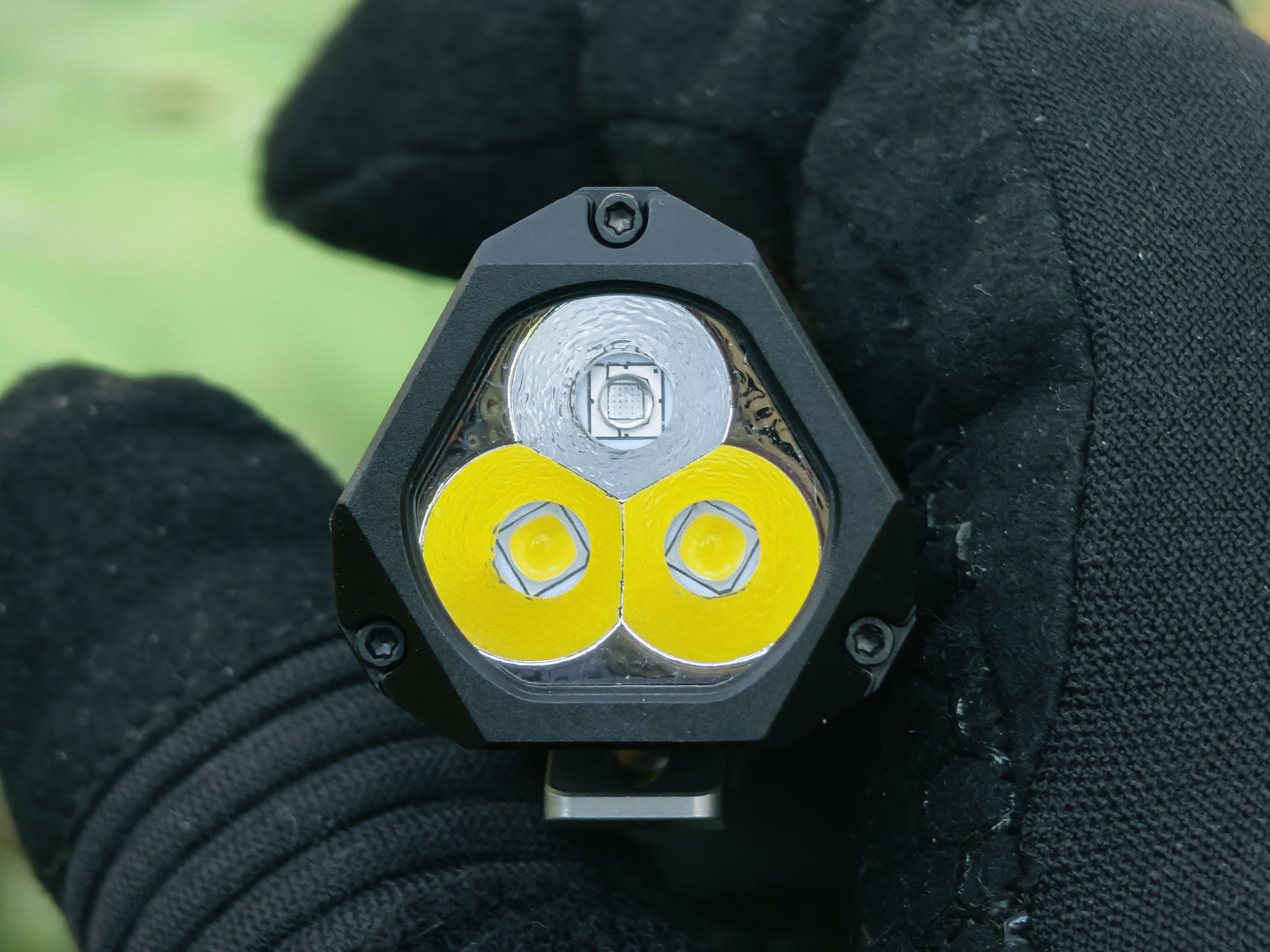 筒头正脸是三颗120°均匀排布的灯珠,上方为UV灯珠,下方是两颗5000K的白光灯珠,共用一个橘皮光杯。