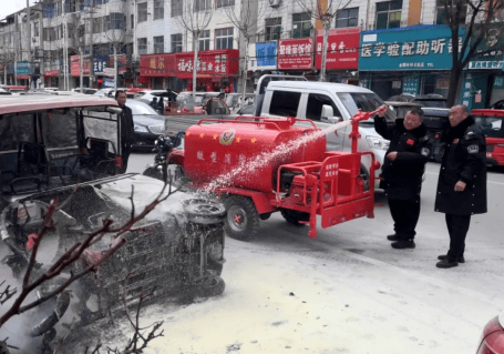 消防员到场后使用水枪对起火电瓶进行喷淋,直至完全熄灭冷却,并叮嘱大爷一定要去正规店铺进行检查维修,避免危险再次发生。