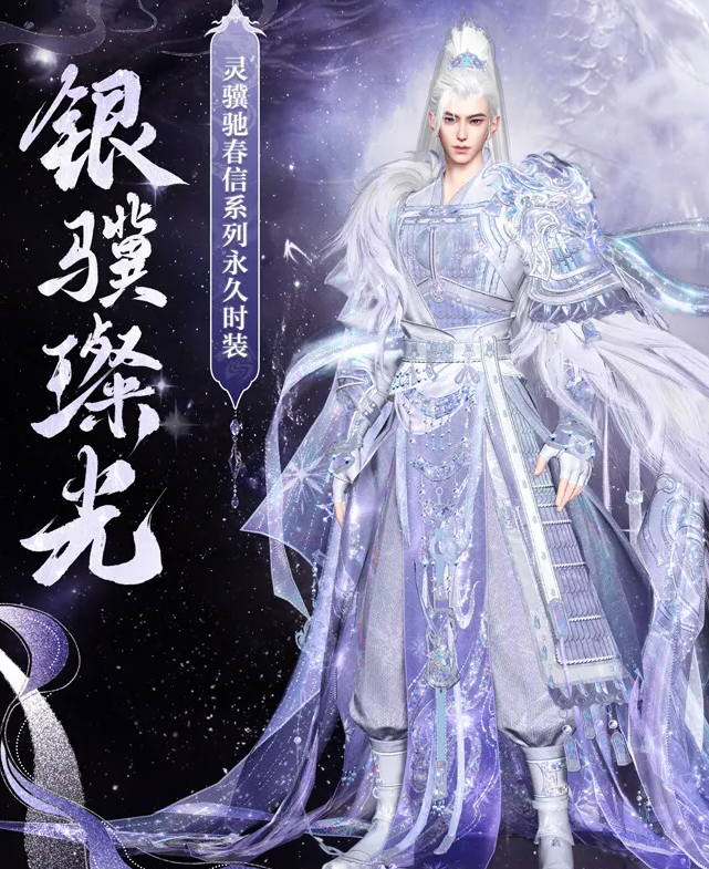 说到马年时装,这次“灵骥驰春信”系列的外观确实亮眼。其中最吸睛的“银骥璨光”套,男款以银白为主色调,剪裁利落修身,腰间宽幅银封束出挺拔身姿,肩甲设计成祥云形状,颇具气势,衣摆处用精细的银丝线勾勒出奔腾的骏马暗纹,穿上它,宛如一位巡游三界的俊朗战神。