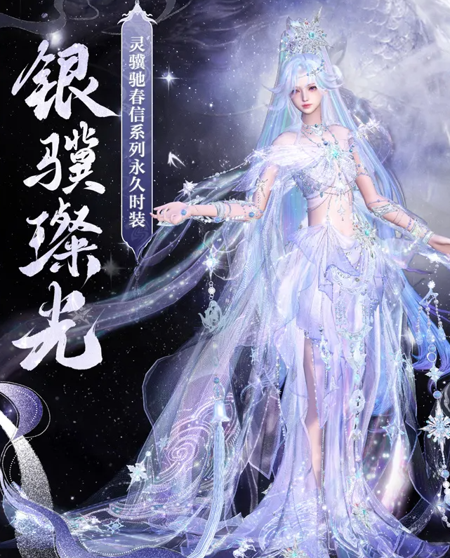 女款则是梦幻的纱裙设计,上身点缀着细碎的星芒,下身渐变色的露腰长裙层叠轻盈,巧妙勾勒出玲珑曲线,整套服装大面积运用银丝绣制,行动间流光溢彩,熠熠生辉。穿上这套约好友去三界景点打卡,随手一拍都是大片。