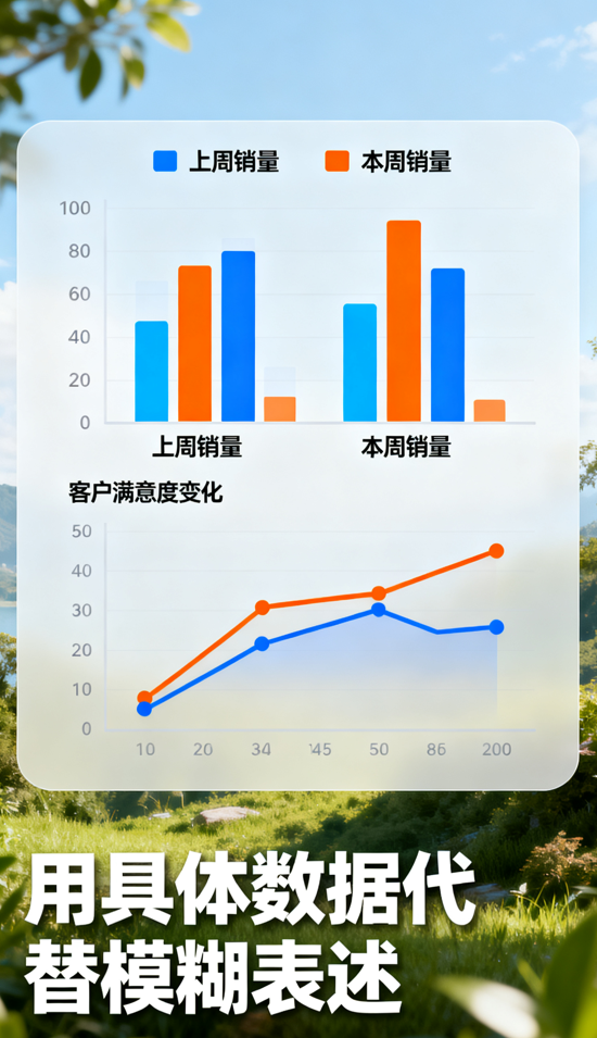 汇报的结尾,一定要用 “具体数据”说话,这是体现汇报价值的关键。以前我总爱说“最近销量有进步”“客户反馈变好了”,领导每次都会追问:“进步了多少?变好的比例是多少?”