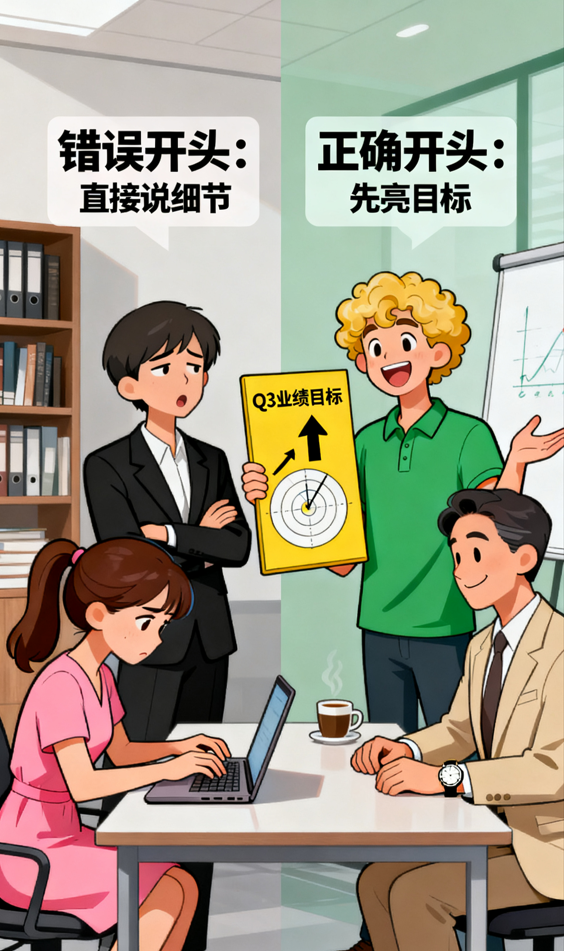 后来我才明白,领导时间有限,更关注汇报的 “核心价值”。正确的做法是,开头用一句话明确“问题或目标”。比如:
