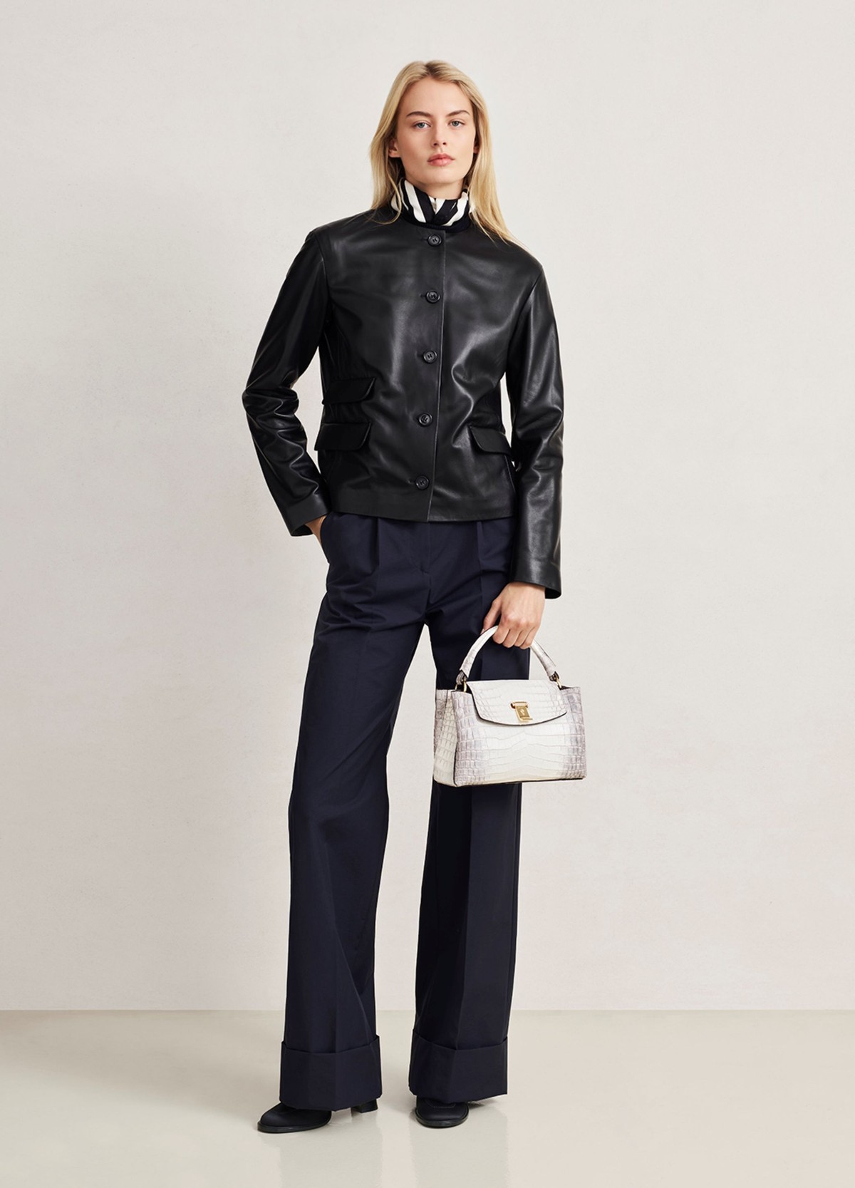 该系列成衣用软结构剪裁、皮革外套、廓形衬衫以及优雅针织,为衣橱增添新意。日装以精美工艺制作结合考究比例,采用清爽府绸、顺滑羊毛以及真丝、羊绒与高科技纤维混纺面料,兼顾层次感叠穿效果与其实用功能。