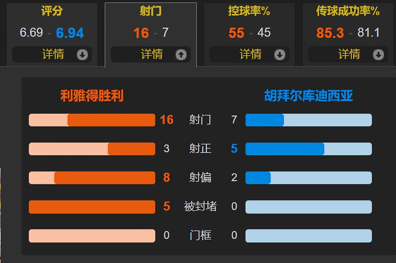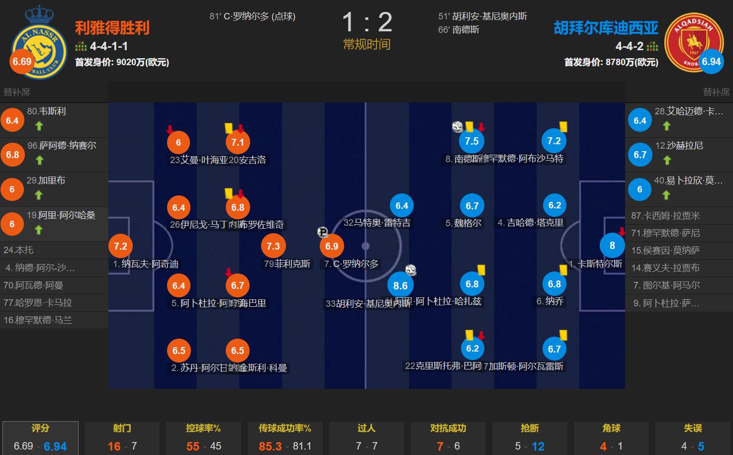 此役,利雅得胜利在主场占据场上优势,但得势不得分。利雅得胜利的控球率为55%,一共获得了16次射门,是胡拜尔库迪西亚7次的2倍多,但利雅得胜利仅有3次射正,还比胡拜尔库迪西亚的5次射正少了2次,说明进攻效率极其低下。C罗又是全场射门最多的球员,5次射门,仅有点射一次射正,赛后获得6.9分的较低分,C罗的点球破门避免了超低分。C罗一点一点迈向“千球伟业”,但利雅得胜利近3轮沙特超足足丢了8分,被利雅得新月反超4分,若下轮客战新月无法赢球的话,那么C罗加盟利雅得胜利的第4个赛季再一次面临联赛丢冠、至今0冠的尴尬!