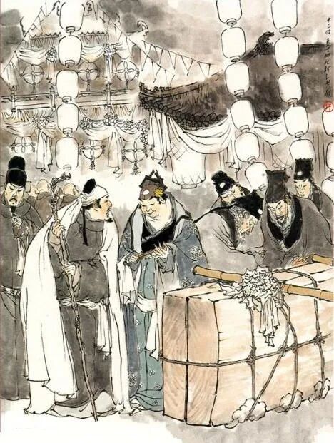 贾政报了丁忧,礼部奏闻,主上深仁厚泽,念及世代功勋,又系元妃祖母,赏银一千两,谕礼部主祭。家人们各处报丧。众亲友虽知贾家势败,今见圣恩隆重,都来探丧。择了吉时成殓,停灵正寝。贾赦不在家,贾政为长,宝玉、贾环、贾兰是亲孙,年纪又小,都应守灵。贾琏虽也是亲孙,带着贾蓉尚可分派家人办事。【15】