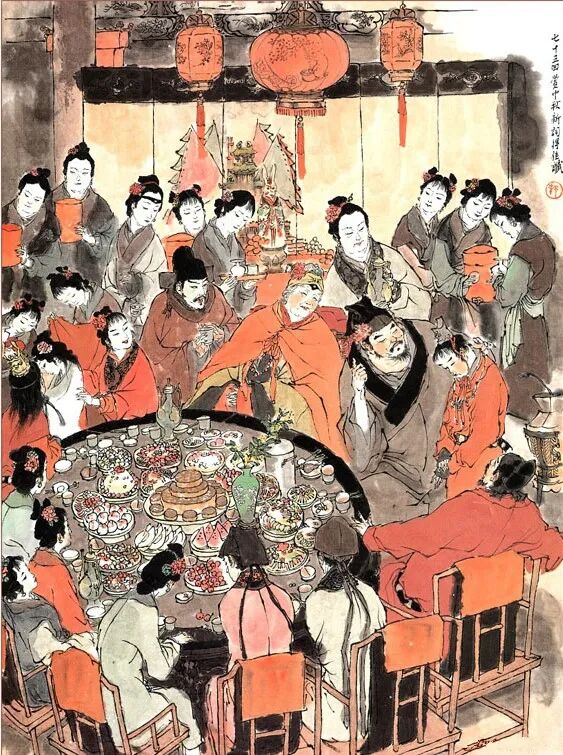 于厅前平台上列下桌椅,又用一架大围屏隔作两间。凡桌椅形式皆是圆的,特取团圆之意。上面居中贾母坐下,左垂首贾赦、贾珍、贾琏、贾蓉,右垂首贾政、宝玉、贾环、贾兰,团团围坐。【10】
