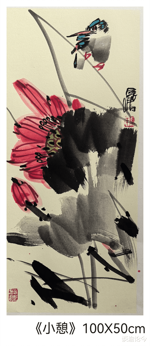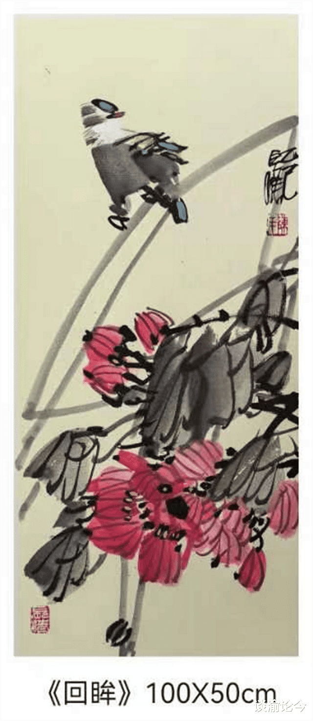 他始终恪守“写意”本真,重笔法力道与章法布局。得闲时常在心中构思打腹稿,立题选材与技法表现成竹在胸。创作时落笔挥运,以书入画,既重笔墨运行的生命力度与“笔情墨趣”,亦兼顾形式美与意境营造。“善观察、能心记、会表达”的眼、手合于一心,让他的“应物象形”堪称“造化心印”——既能放笔直抒胸臆,物象生发酣畅,气韵生动;构图逻辑亦与其人生轨迹契合,熔铸“国画六法”与现代审美,画风诚朴古雅又蕴秀逸灵动,不失当代气息。这份新颖藏在花、叶勾写及雀鸟姿态的概括中:弃传统写实之繁复,以几何化意笔线条解构程式化技法,更显鲜活。