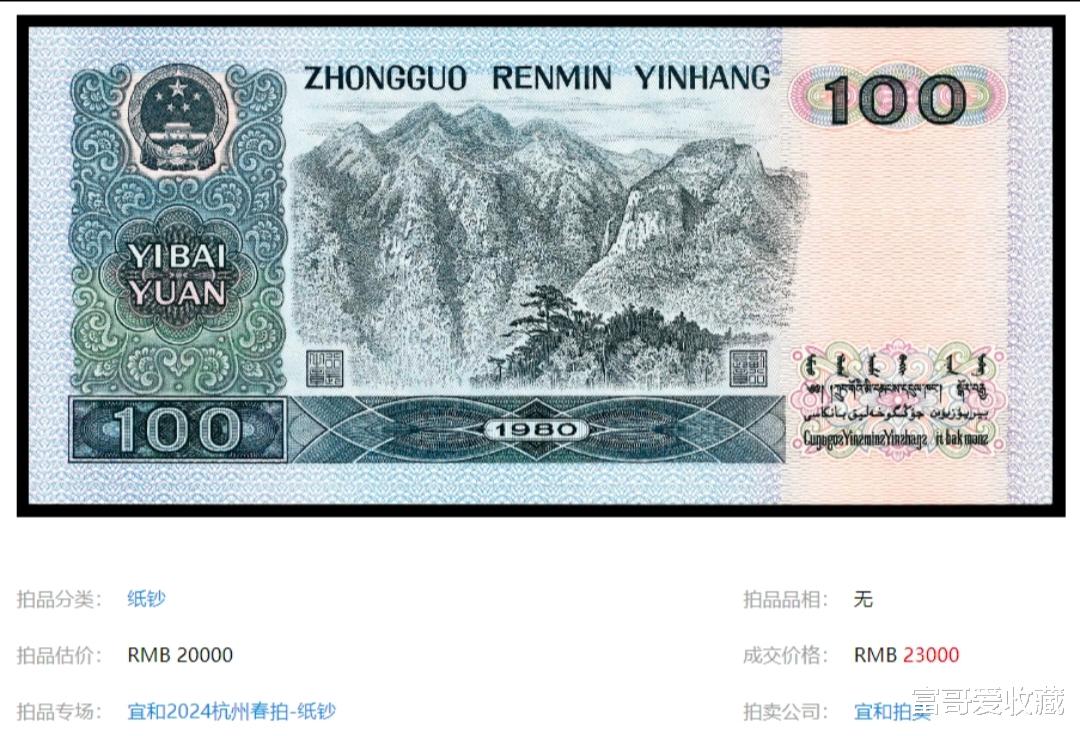 就比如上面这张1980年的100元,在宣和钱币拍卖会中,就拍出了2.3万。
