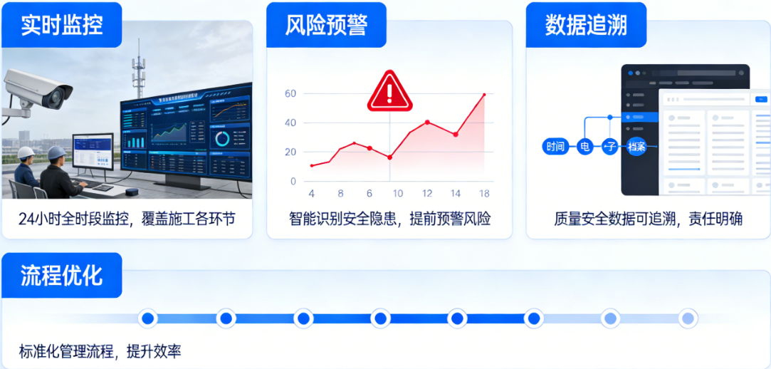 在应用价值方面,系统不仅实现了项目进度、成本、质量、安全的全流程管控,提升管理效率与水平,还通过数据可视化、智能分析等功能,为项目决策提供精准数据支撑,帮助管理人员优化决策方案,降低项目风险。同时,系统推动工程管理流程标准化、规范化,提升行业整体管理水平,助力企业提升核心竞争力。