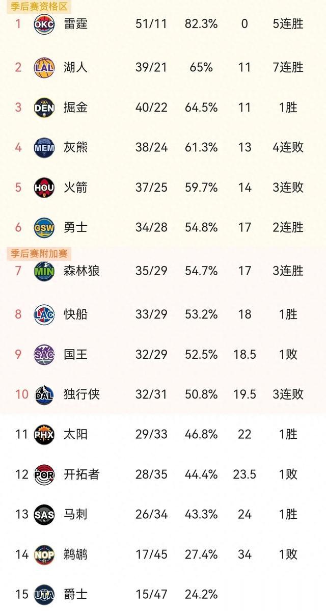 今天比赛结束后,联盟各支球队都已经打完了60-62场比赛,赛季已经进入了最后的冲刺阶段,西部各队最新的排名情况如下:
