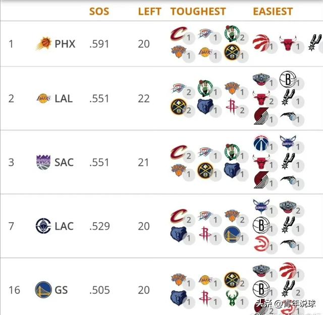剩余赛程难度将在一定程度上影响球队的排名,尤其对于季后赛&附加赛排名竞争激烈的球队来说更是如此。美媒根据剩余赛程对手胜率为依据统计了联盟30支球队的剩余赛程难度排名,其中西部热门球队的总结如下: