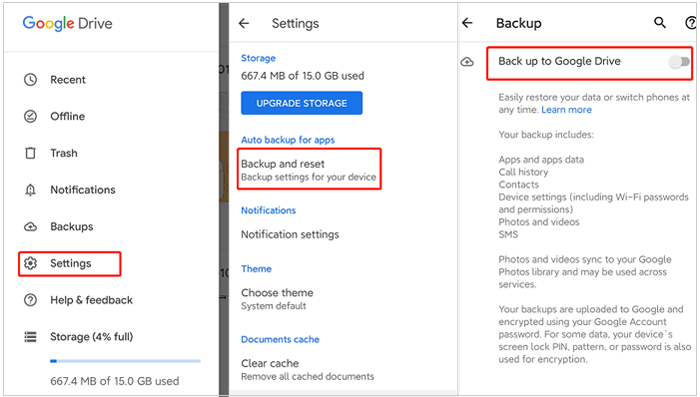 步骤二:在您的旧LG手机上,打开Google云端硬盘应用并登录您的Google帐户,然后点击左上角的菜单图标,选择“设置” > “备份和同步” 。您旧手机上的数据将自动备份到Google云端硬盘。