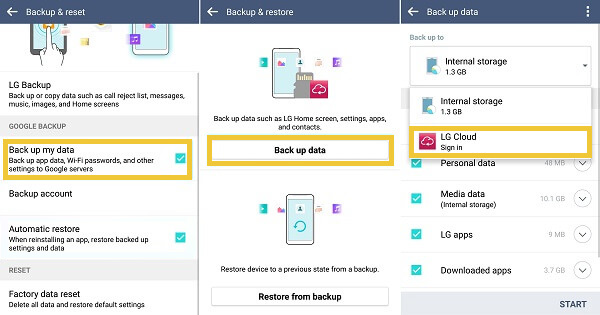 解锁您的旧 LG 设备,然后依次进入“设置” > “通用” > “备份和重置” >开启“备份我的数据”和“自动恢复” > “备份到 LG 云”。您需要登录您的 LG 云帐户。