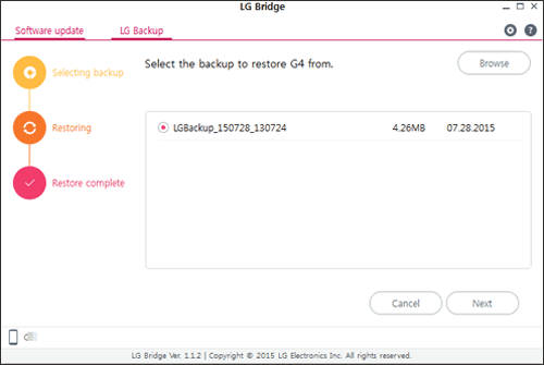 备份完成后,通过 USB 数据线将新 LG 手机连接到电脑,然后依次选择LG Backup > Restore > 选择上次的 LG 备份并点击Next > 选择要恢复的备份文件,然后点击Start 。