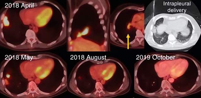 纪念斯隆凯特琳癌症中心研究人员于2021年在《Cancer Discov》发表了CAR-T细胞疗法联合帕博利珠单抗用于恶性胸膜疾病(包括转移性肺癌和乳腺癌以及恶性胸膜间皮瘤)的I期临床试验结果。这项研究创新性地采用了区域性给药联合免疫检查点抑制剂的策略,研究显示:患者的中位总生存期达到23.9个月,1年生存率高达83%。更值得关注的是,一名恶性胸膜间皮瘤(MPM)患者联合治疗后靶病灶减少了78%,并且持续缓解了26个月。另有8名患者疾病稳定(SD)维持了≥6个月,且生活质量良好,长时间无需后续治疗。