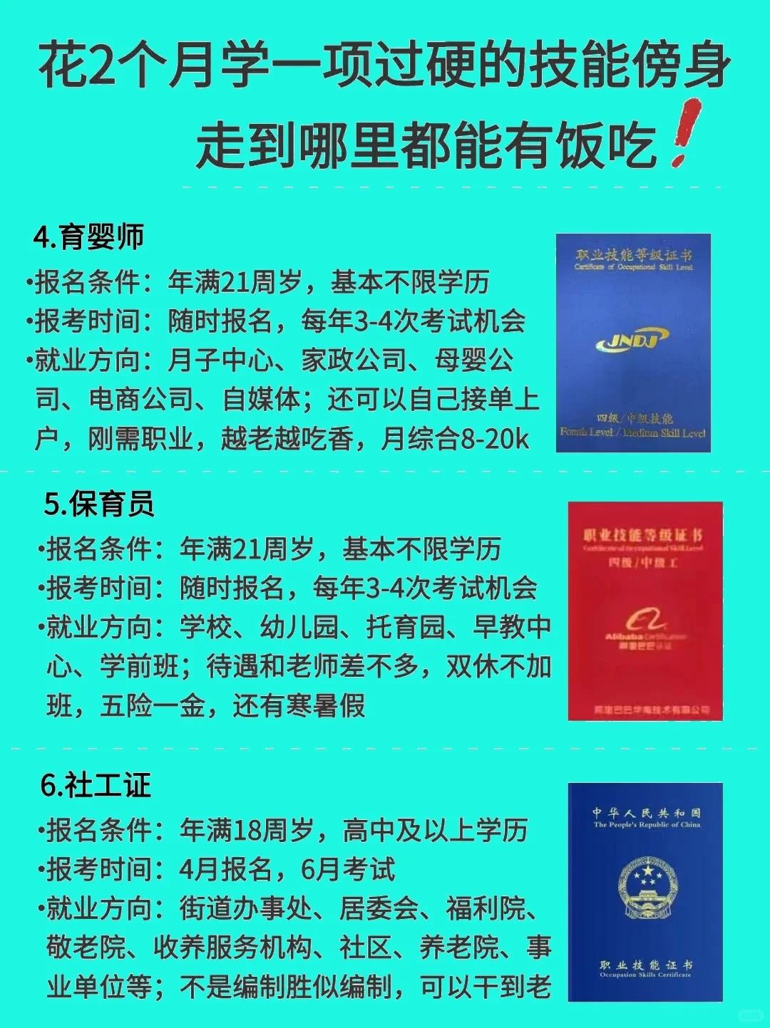 💼【稳定体面|长期发展】 🔹 教师资格证:寒暑假+福利好|考编考公必备 🔹 社工证:街道/福利院/事业单位|干到老的工作 🔹 保育员:双休+寒暑假|待遇同老师|五险一金