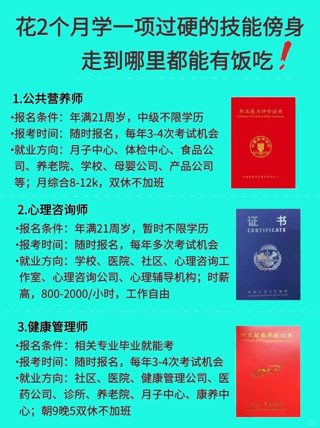 🌟【热门推荐|女生友好型】 ✅ 公共营养师:不限学历|月入8-12K|双休不加班 ✅ 心理咨询师:时薪800-2000|工作自由|自我成长 ✅ 健康管理师:朝9晚5|医院/养老院/月子中心刚需 ✅ 育婴师:月入8-20K|上户接单|越老越吃香 ✅ 整理收纳师:时薪计费|家政/自媒体双栖|现在超流行