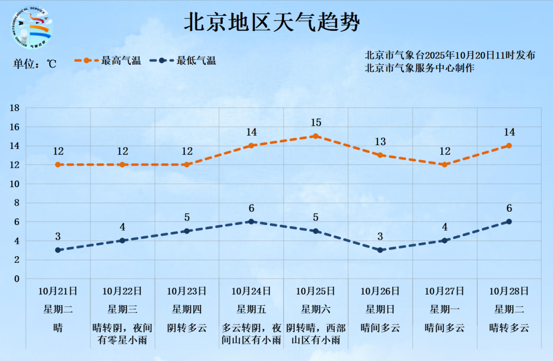 今天(10月21日)北京晴冷天气在线,最高气温13℃,最低气温2℃。明天,北京天空云量增多,将有一次降水过程,小雨上线,高海拔山区有小雪。