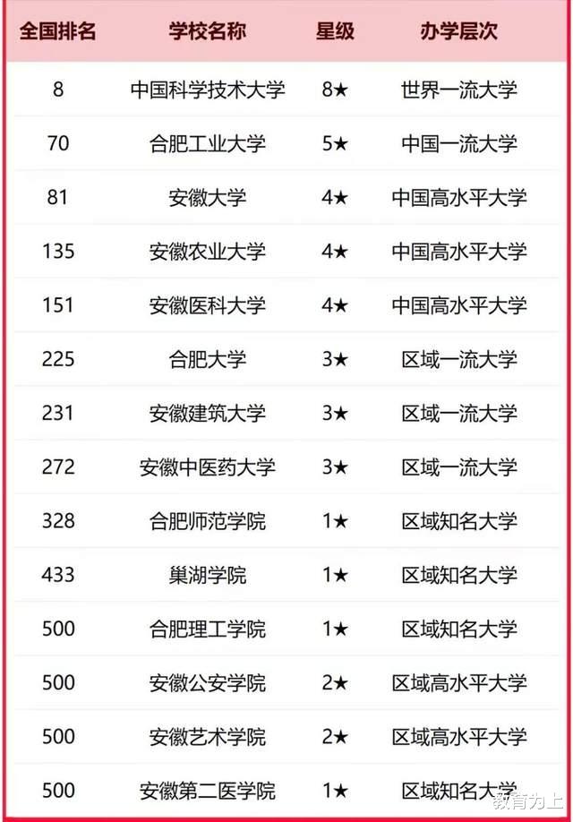 在这份榜单中,共计41所合肥市高校上榜,上榜高校既包括我国原985工程大学、原211工程大学的中国科学技术大学、合肥工业大学等,也包括合肥市高职院校的安徽审计职业学院、安徽警官职业学院等。