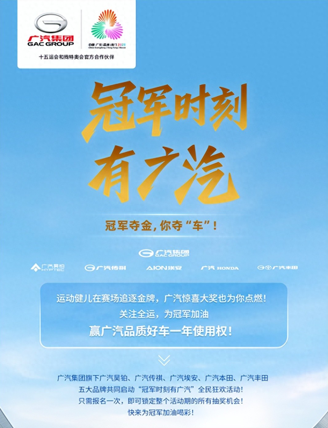 当第十五届全国运动会的呐喊声传遍大江南北,广汽集团也正用一场别开生面的全民互动,把赛场外的热情推向高潮。“冠军时刻有广汽”——这不仅是一句口号,更是一场实打实的福利派送行动,让每个普通人都有机会在全运热潮中收获属于自己的惊喜。
