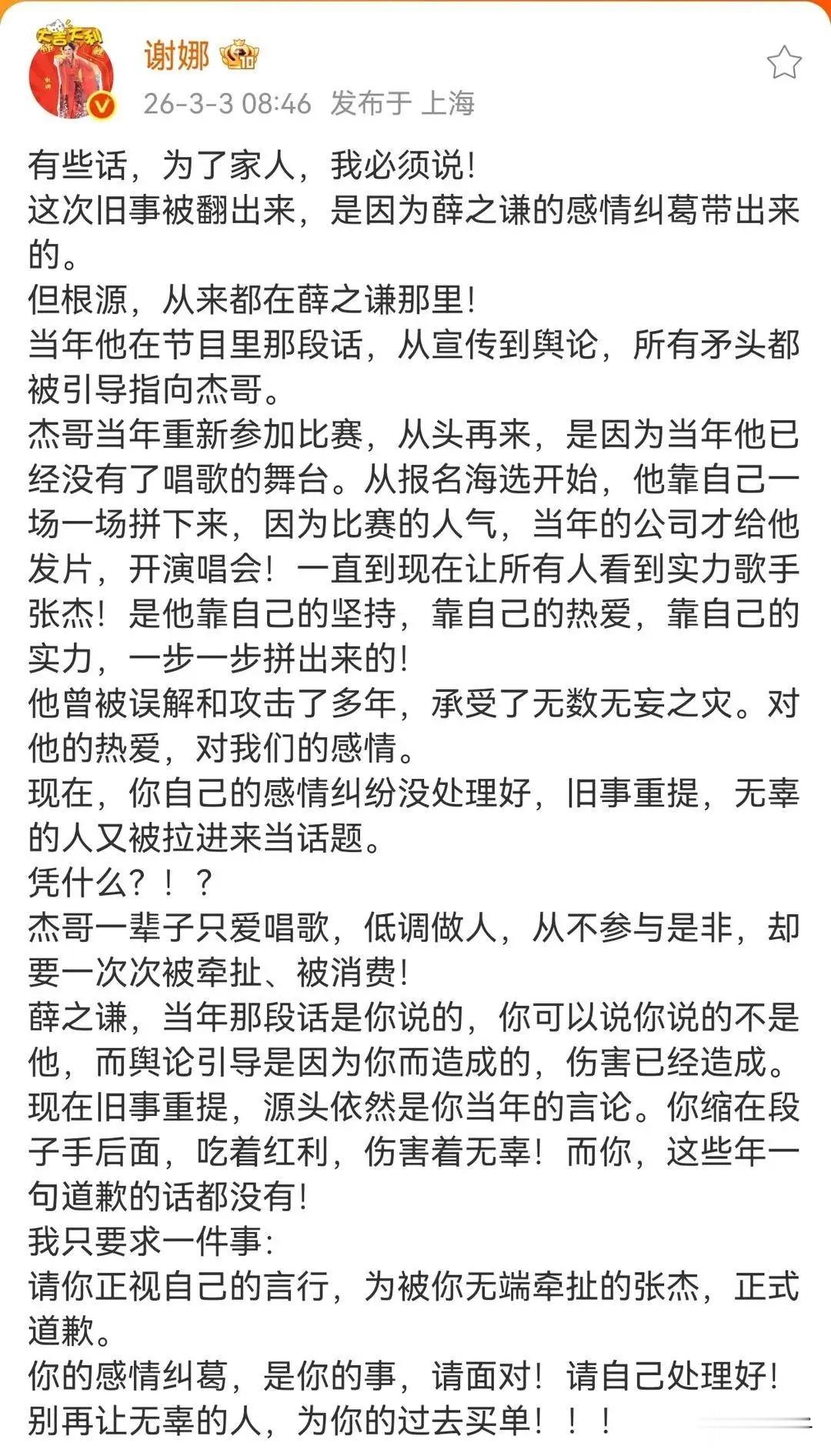 谢娜当场破防,发布千字长文公开要求薛之谦为9年前的言论道歉,痛斥对方“缩在段子手人设后吃红利,让张杰承受了9年无妄之灾”。