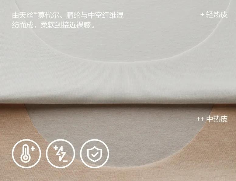 7系则采用超细羊毛、腈纶和中空涤纶,搭配进口莱卡面料组合。超细羊毛的应用不仅能增强锁温能力,也能提供更柔和的触感体验;而中空涤纶、腈纶的蓬松构造,能在更轻克重的基础上实现更好的保暖效果,避免内衣显得过于臃肿、笨重。