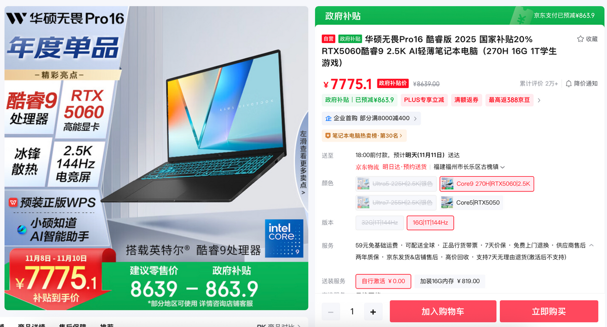 当下对于忙碌的学生党、职场人、创作者来说,一台性能强大、AI智能的笔记本电脑是提升生产力与工作效率的最佳助手。双十一大促作为年末升级装备的绝佳时机,给还在苦恼中的各位朋友们推荐华硕无畏Pro16 2025,顶级硬件配置、高分高刷大屏搭配AI助手,助你轻松应对学习、办公与创作的多重挑战。双十一部分地区购机可享至高10%政府补贴(活动详情可咨询客服了解),到手价7775.1元。