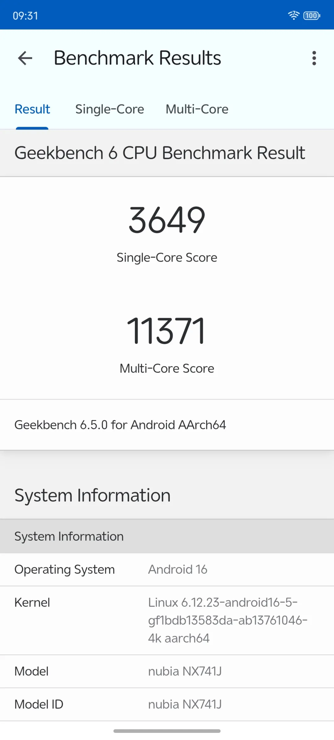 在具体测试环节,在Geekbench 6 CPU Benchmark测试中,努比亚Z80 Ultra(设备型号nubia NX741J)取得了单核3649分、多核11371分的优异成绩。这一数据不仅远超同类产品,更在单核和多核性能上均达到了行业领先水平。无论是日常应用的多任务处理,还是大型游戏的复杂运算,努比亚Z80 Ultra都能轻松应对,确保流畅无阻的使用体验。