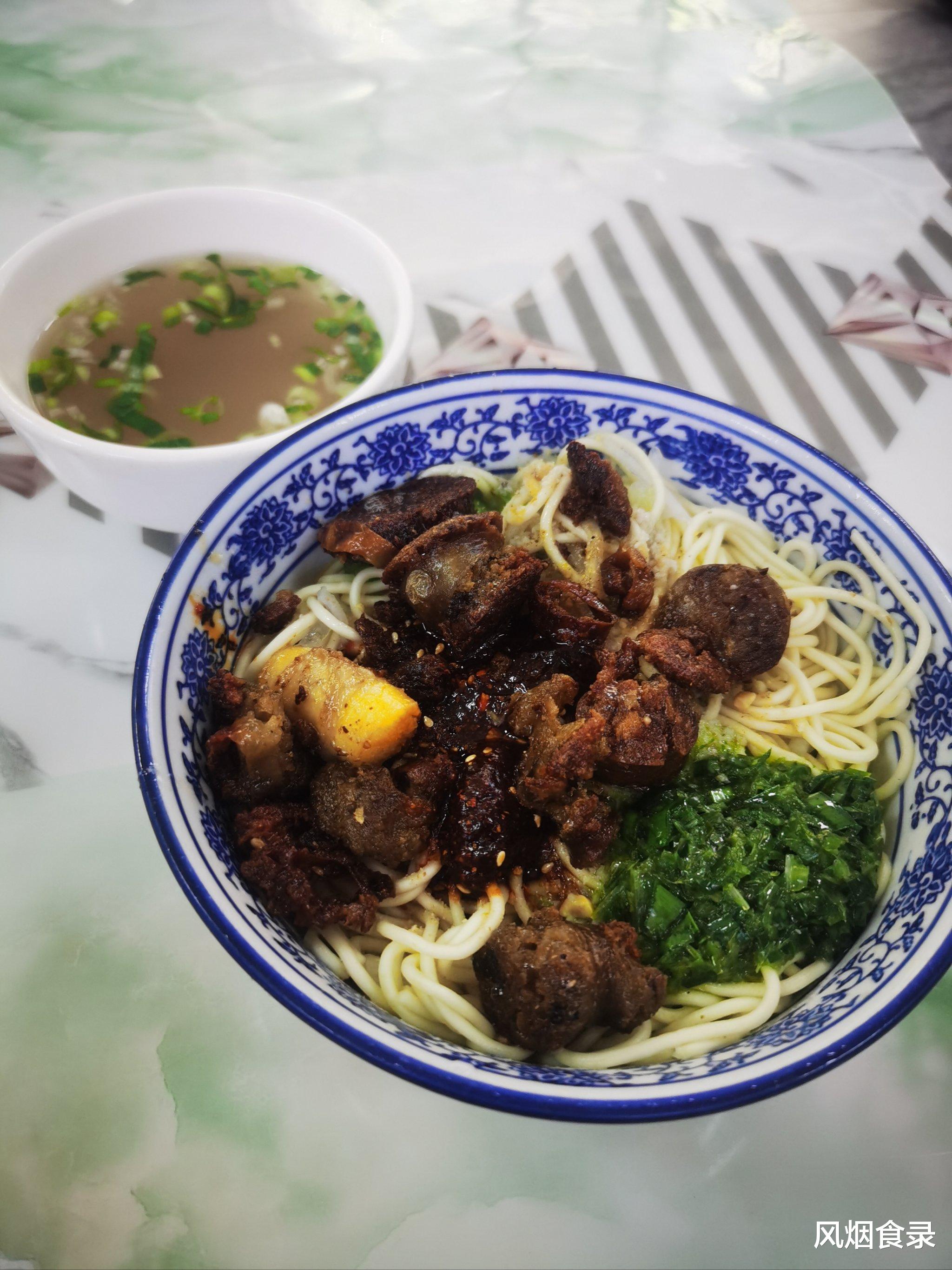 面条揪成雀舌状,在牛骨汤里滚三滚,浇上羊肠和梢子汤,撒把葱花辣油,