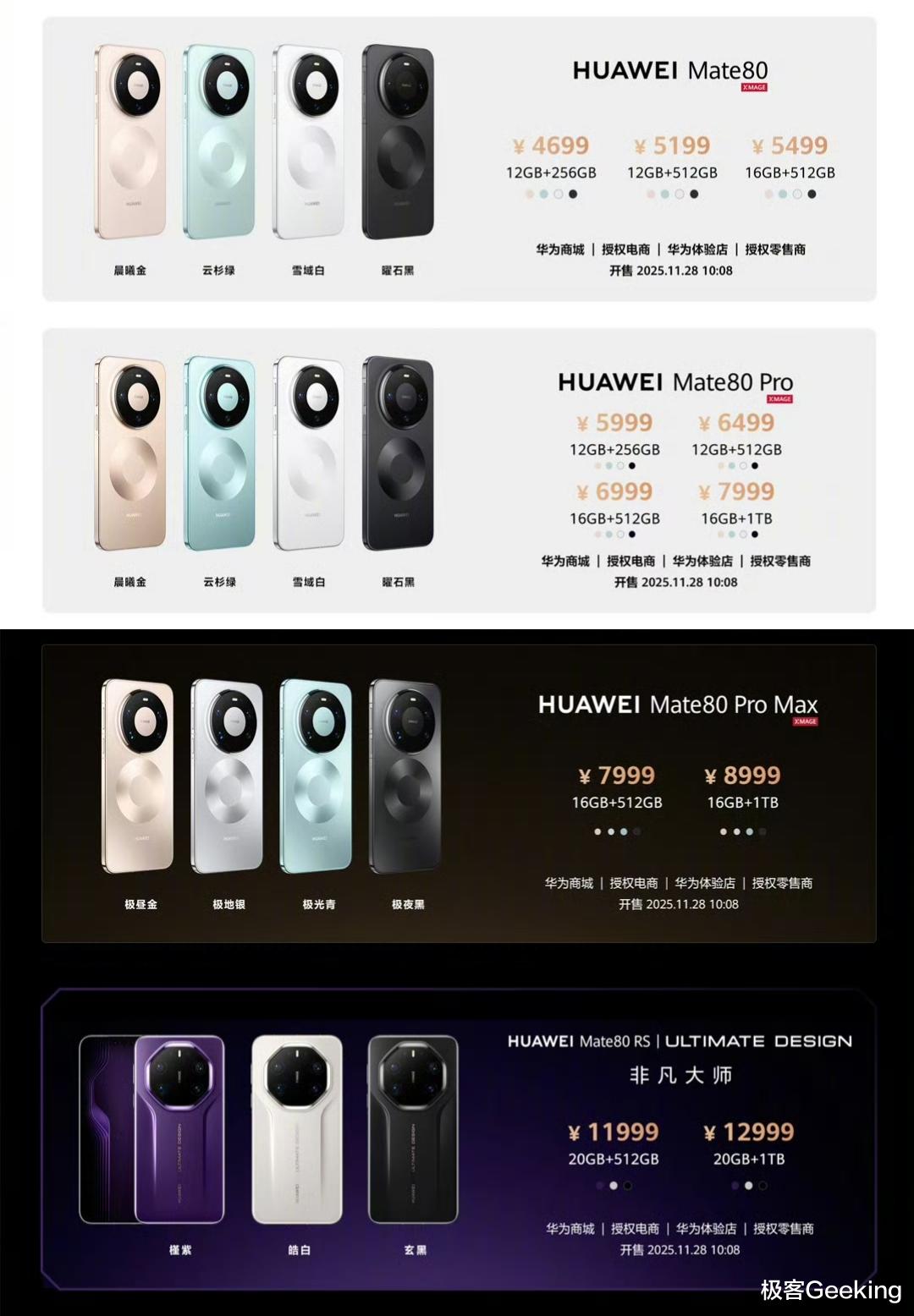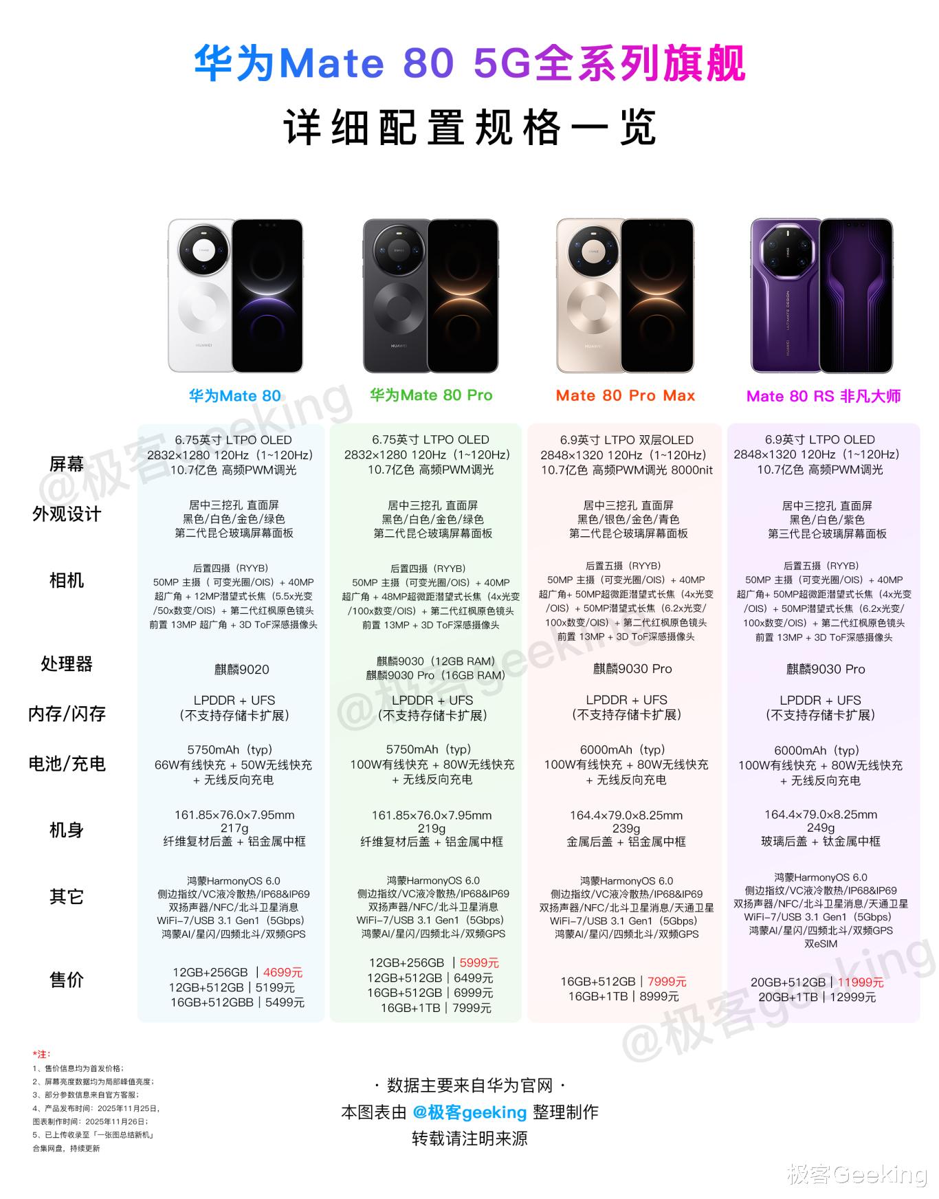 Mate 80 Pro 和 Mate 80 Pro Max 则是便宜了 500 元,RS 非凡大师版本的价格则没有变化,不过运行内存从 16GB 升级至 20GB,首先把华为Mate 80 全系列的完整价格信息总结如下: