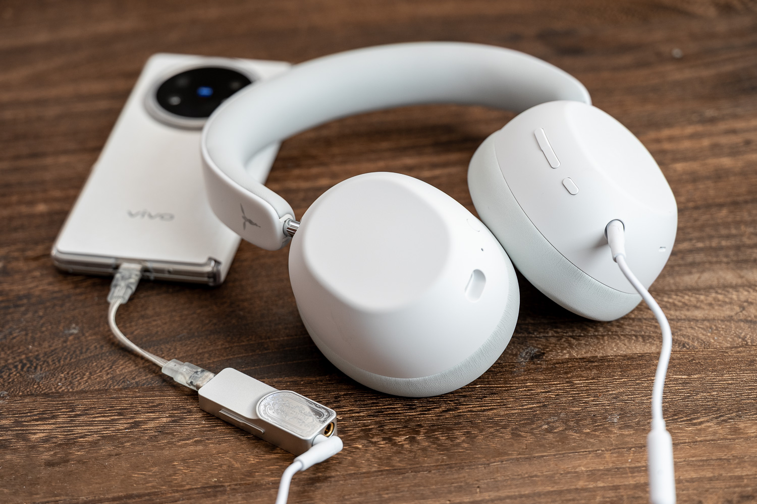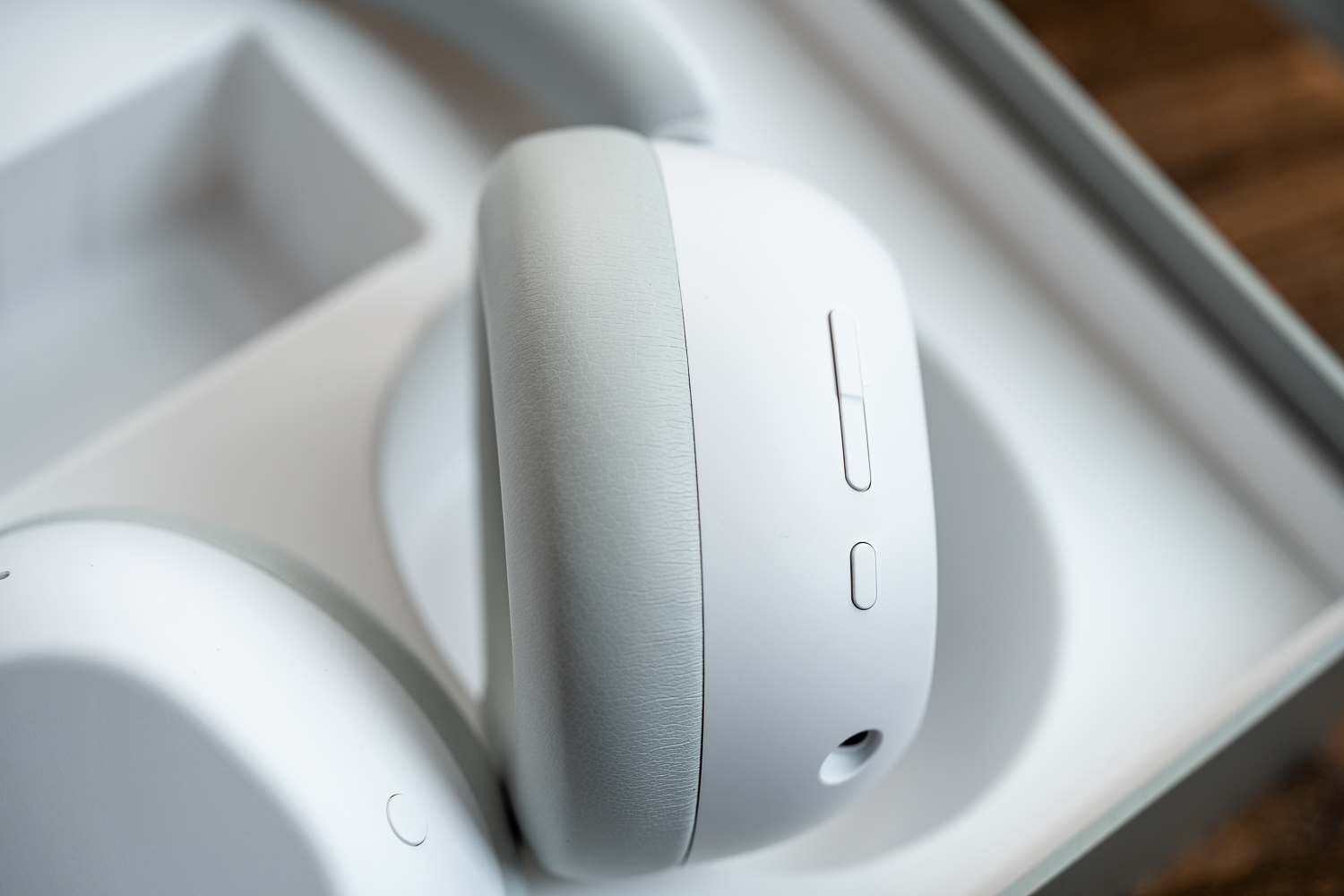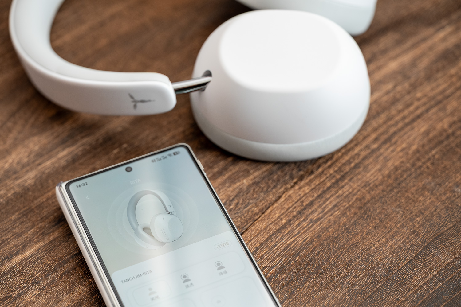 RITA通体白色为主,乍一看非常时尚美观、细看之下的做工也非常精湛,不输任何国际大厂的旗舰型号的精致程度,并且表面主要采用了类肤涂层,摸起来非常温润亲肤,机身的整个线条也都偏柔和,而头梁两侧露出的金属架又恰到好处地给耳机整体增添了一点现代感与科技感。在设计的倾向性上,我认为RITA并没有试图把腔体做小,能够看出它的耳罩外侧凸起的部分非常丰满,所以TANCHJIM也做了一些弧线的处理来减少“视觉体积”,头梁的部分也刻意做了细了一些,不然可能整个机身可能会看起来偏臃肿。RITA本身并不支持折叠,但是耳罩可以翻平去放在收纳袋里,差旅出行的话也不会太占地方,但是随身的小胸包或者秋冬外套的口袋就肯定是塞不进去了。也许是出于整体视觉简洁度的考虑,RITA机身的这些物理按键都没有做标识,不过也没有什么上手门槛,独立的按键便是开关机键、降噪模式切换键,而另一侧的三个按键显然就是传统的“三大金刚键”,分别用于控制音量和播放/暂停,并且也可以通过长按的方式实现其他的一些基础操作。
