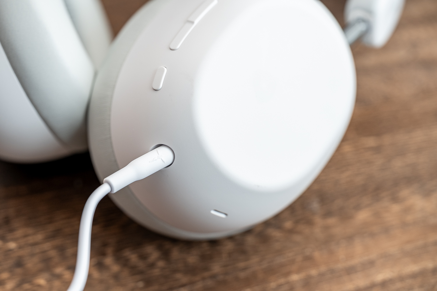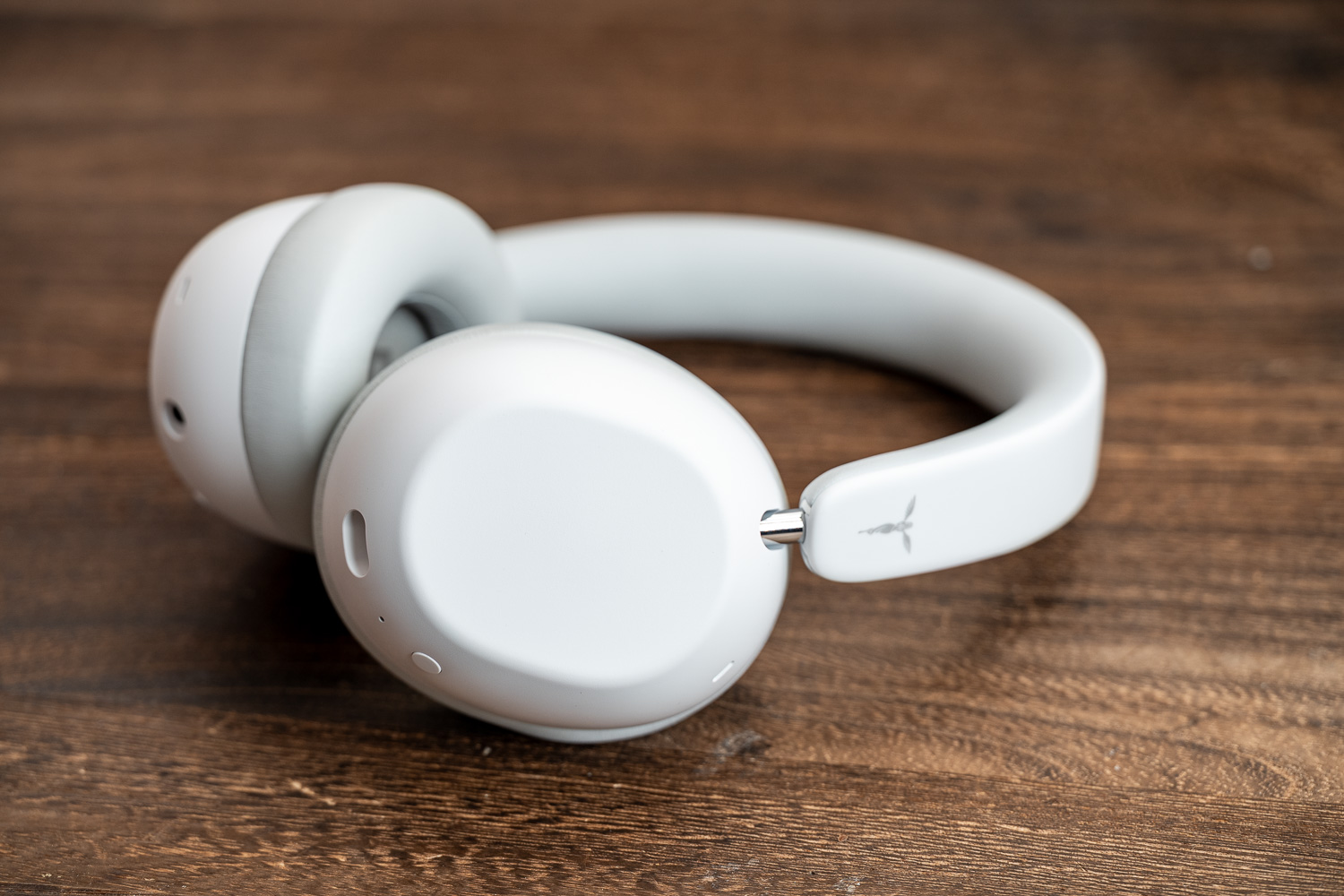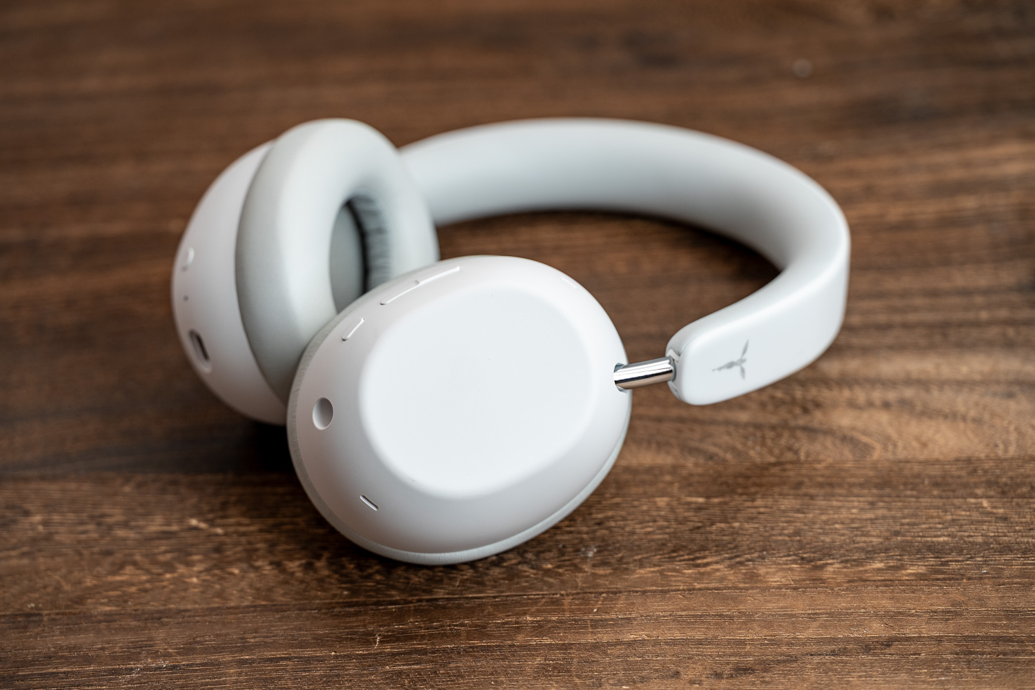 RITA通体白色为主,乍一看非常时尚美观、细看之下的做工也非常精湛,不输任何国际大厂的旗舰型号的精致程度,并且表面主要采用了类肤涂层,摸起来非常温润亲肤,机身的整个线条也都偏柔和,而头梁两侧露出的金属架又恰到好处地给耳机整体增添了一点现代感与科技感。在设计的倾向性上,我认为RITA并没有试图把腔体做小,能够看出它的耳罩外侧凸起的部分非常丰满,所以TANCHJIM也做了一些弧线的处理来减少“视觉体积”,头梁的部分也刻意做了细了一些,不然可能整个机身可能会看起来偏臃肿。RITA本身并不支持折叠,但是耳罩可以翻平去放在收纳袋里,差旅出行的话也不会太占地方,但是随身的小胸包或者秋冬外套的口袋就肯定是塞不进去了。也许是出于整体视觉简洁度的考虑,RITA机身的这些物理按键都没有做标识,不过也没有什么上手门槛,独立的按键便是开关机键、降噪模式切换键,而另一侧的三个按键显然就是传统的“三大金刚键”,分别用于控制音量和播放/暂停,并且也可以通过长按的方式实现其他的一些基础操作。