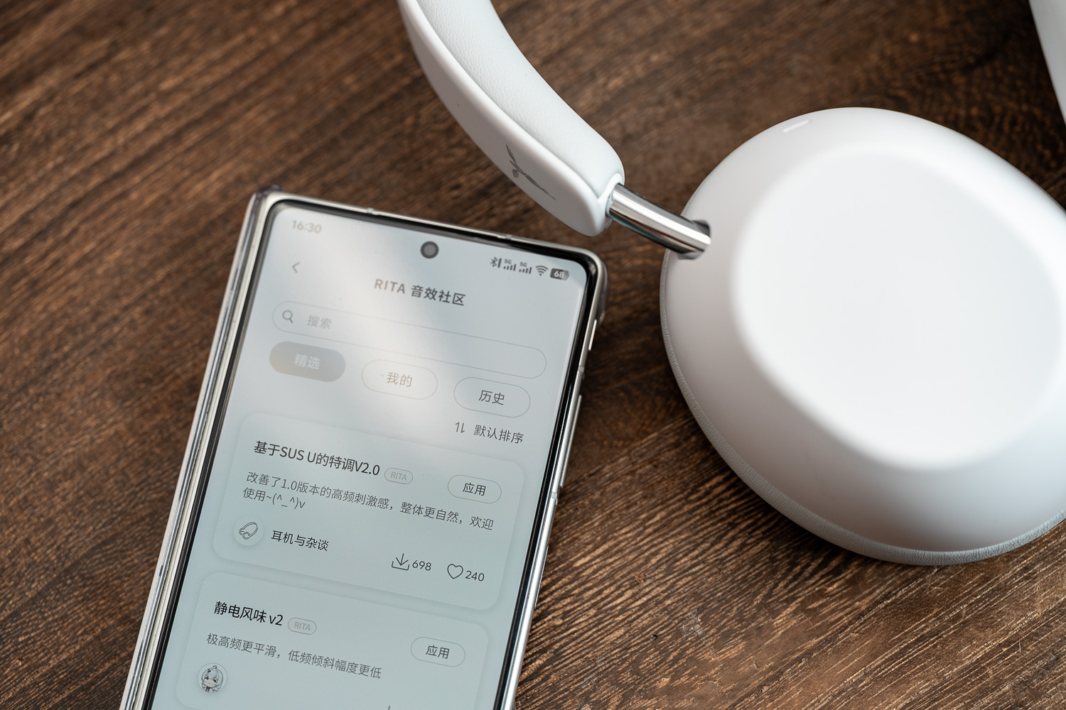 佩戴方面,RITA有它做的特别到位的地方、也有一些小遗憾,做的好的地方在于耳罩的柔软度、头梁正中心接触头顶的柔软度,触感都相当舒适,而且整体的耳机对内收力的控制很适当,即便是我这种头围宽且戴眼镜的人也不会觉得有压迫感和夹头感,同时轻量化也做的足够好,但它看似偏大的腔体可能更多的空间是用在塞内部元器件上,耳罩部分的容积与深度都不算大,对招风耳来说会觉得包耳感不够,对小耳朵来说肯定还是冗余的,所以它并不能够像类似Bose这样的大厂那样做到近乎人人都完美的佩戴,但是和索尼、宝华、森海等厂商差不多是接近的水平,就我个人而言差不多是属于可以舒适佩戴2-3个小时,耳朵软骨就会硌着疼的状态,但我这个人的例子比较极端,对大部分人来说不具备参考性,至今远途出行还是QC45的钉子户。而如果横向对比目前500档位及以内的友商们的佩戴舒适度,RITA我认为是第一档的水平,更不用谈颜值、做工这方面的优势。