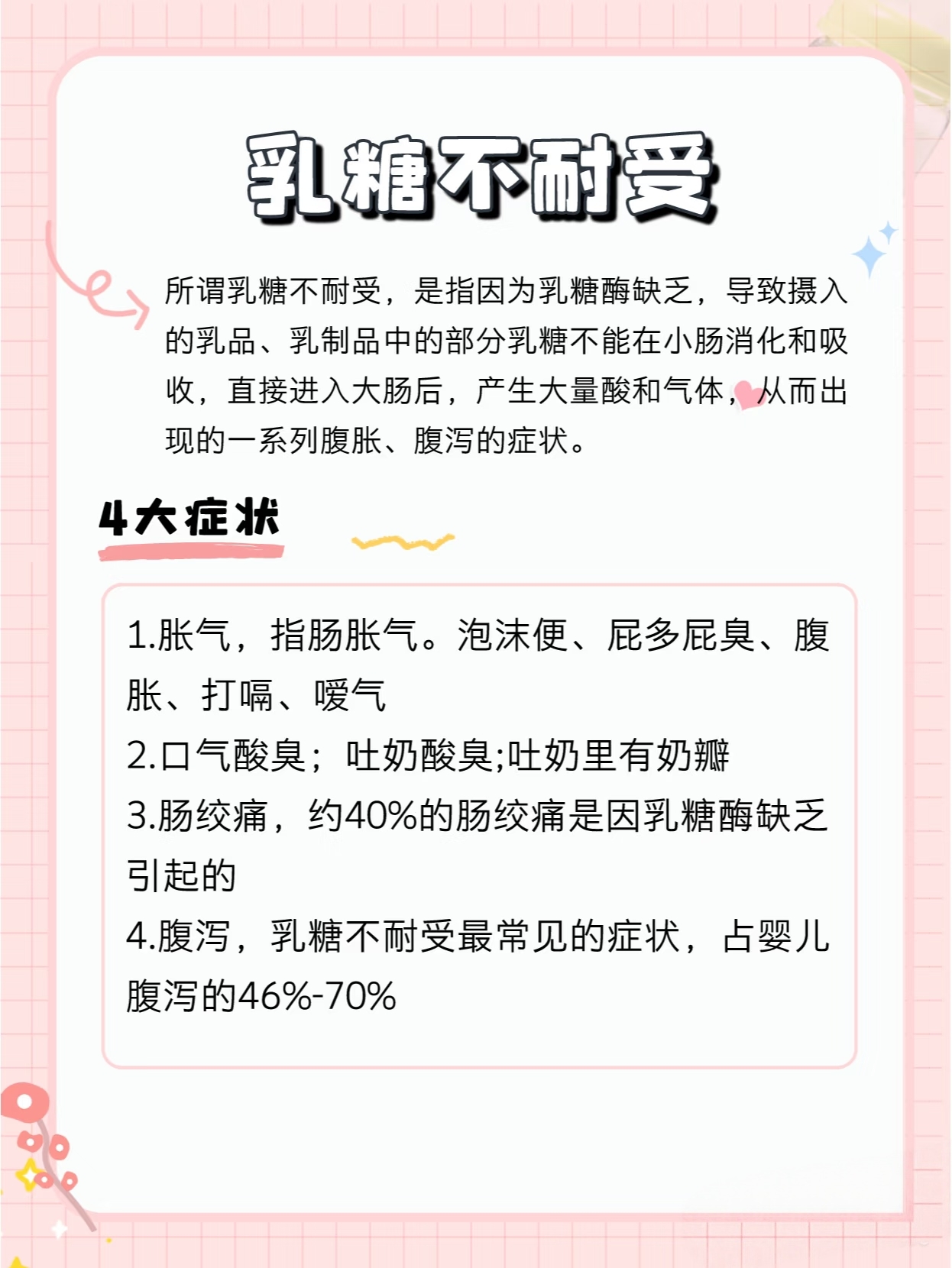 · 乳糖不耐受,是小肠里酶不够,消化不了糖,主要症状集中在消化道——腹胀、腹泻、屁多。