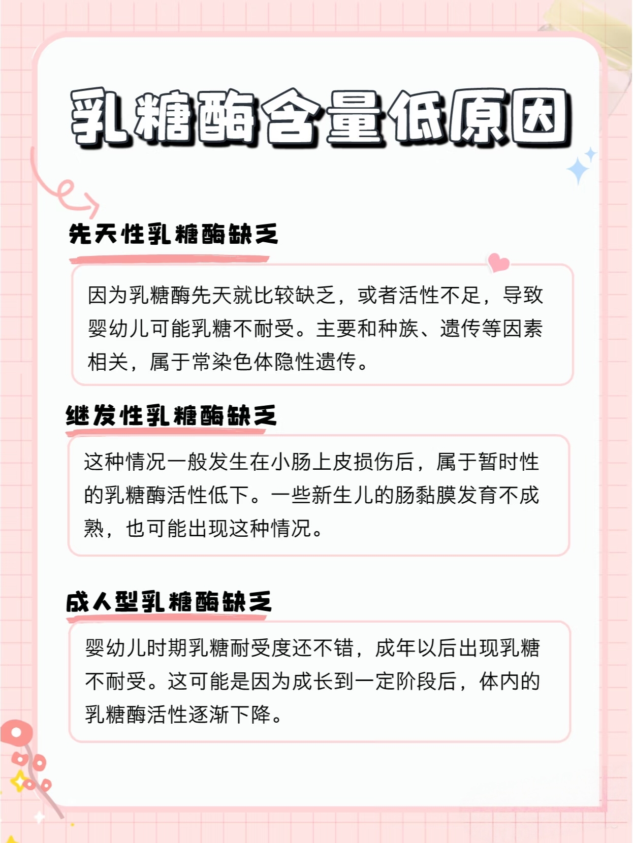 但你要知道,大多数宝宝出生时都是能正常合成乳糖酶的。只是随着年龄增长,或者在某些特殊时期(比如肠道感染后),乳糖酶的产量会暂时“掉链子”。