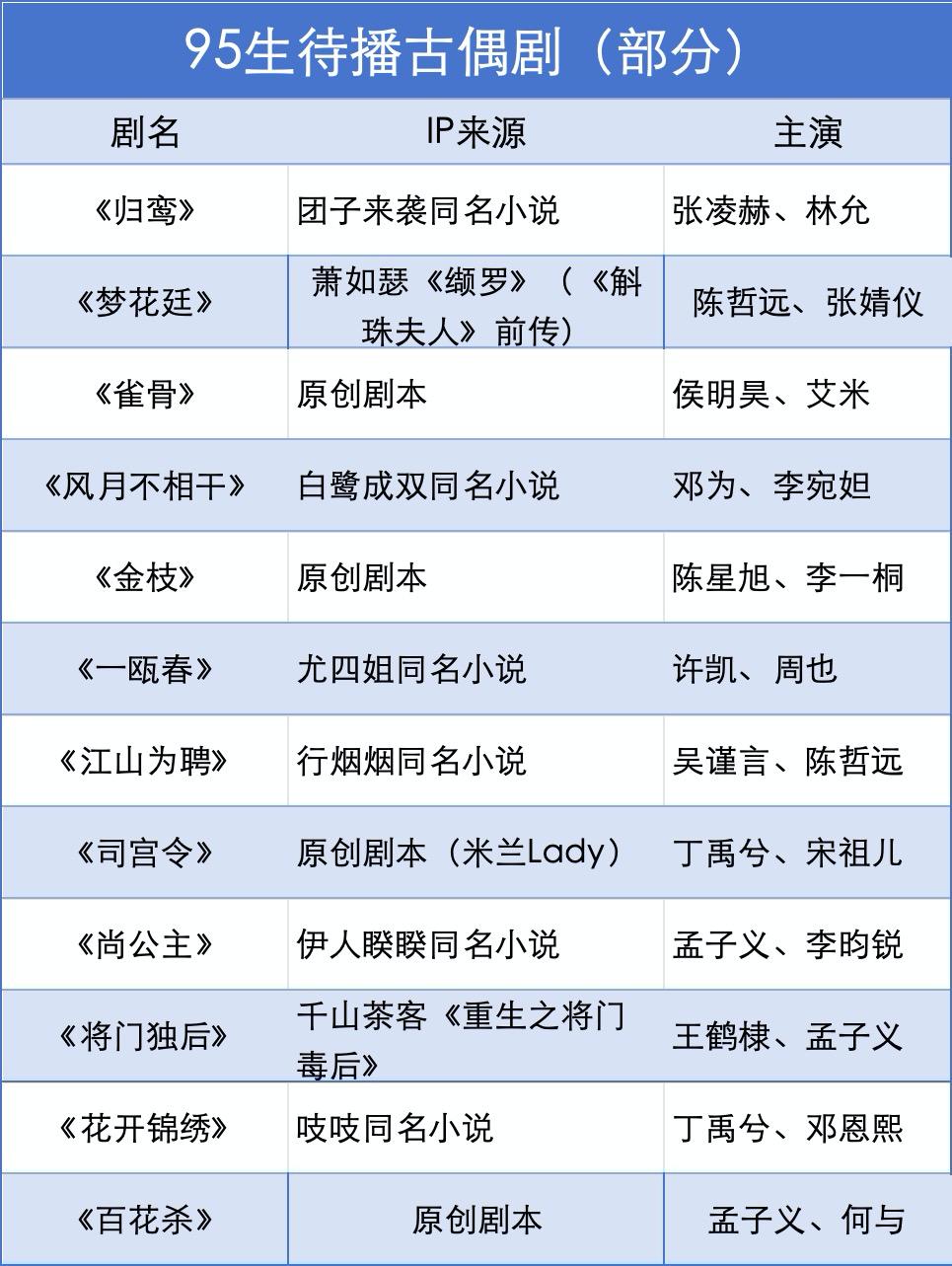 TOP君结合公开数据梳理了部分待播古偶剧发现,“大IP+当红小生+当红小花”的组合仍是标配。其中,孟子义与李昀锐二搭的《尚公主》、张凌赫与林允主演的《归鸾》、王鹤棣与孟子义主演的《将门独后》呼声颇高。