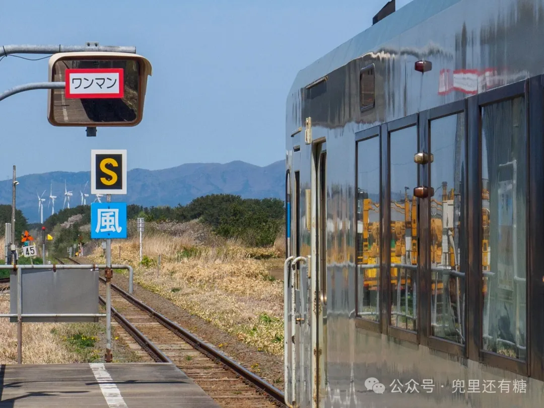 站台的尽头有一个标牌,上面写着“S”和“Kaze”,但这显然是强风导致的限速区的标牌。远处是一组用于发电的风车。大凑线似乎因强风而停运多次,这是有道理的。