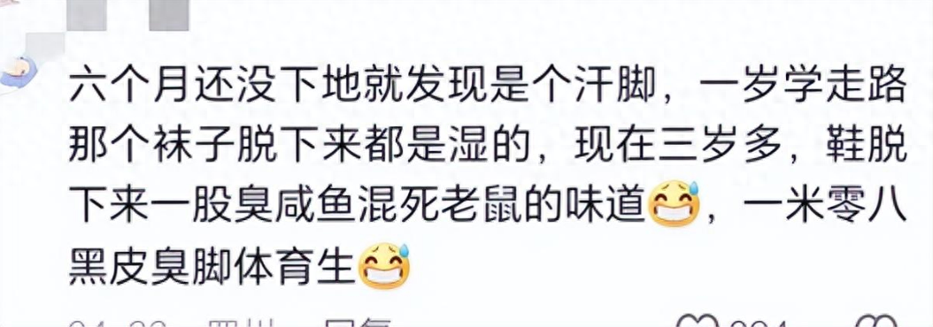 我儿子一年级开始脚特别臭!每天换鞋袜。我有一次说,当初他小时候我怎么把他脚丫放在嘴里的