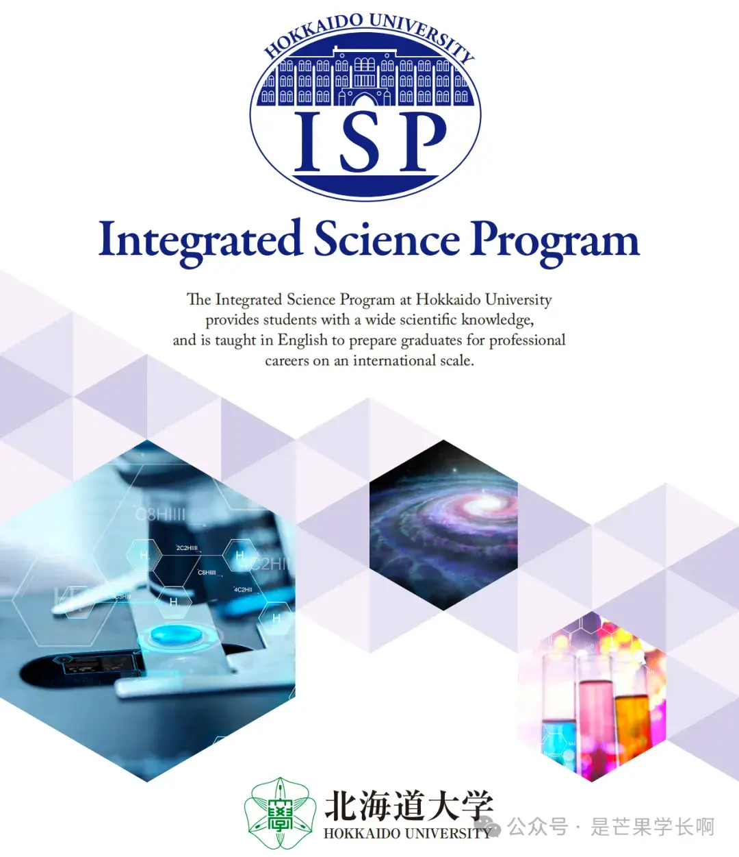 该项目主要包括四年制学士学位和两年制硕士学位。硕士学位将包括一个积极的研究部分,学生将进入北海道大学著名的研究生院学习技术和技能,以便在学术界或学术界以外的领域成为一名出色的科学家或研究人员。通过北海道大学的提前毕业计划,我们为积极进取、能力出众的学生提供了在3.5年和1.5年内完成学士和硕士课程的机会。这样,合并课程的学制仅为5年,比大多数国际大学都短,使毕业生在竞争激烈的就业市场上更具优势。由我们的国际教师授课,学生有机会以国际科学语言(英语)接受本科教育。这与日本的卓越科学记录相结合,为ISP学生提供了专业英语知识、技能和威严。事实上,该课程致力于为学生提供科学背景所需的技能,包括演绎、调查、推理和解决问题的能力。