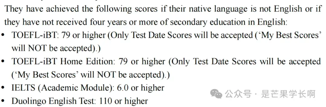 英语要求:托福(含家考)79及以上、雅思6.0及以上、多邻国110及以上