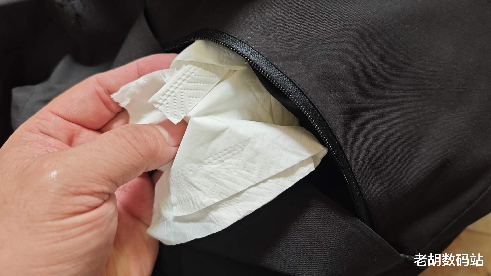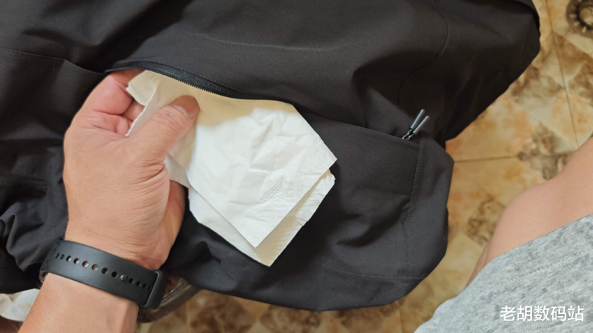 在实际防水测试中,我把干的纸巾放入口袋中,然后直接用花洒喷,从上面的动图就可以看出,完了之后,拿出纸巾,非常的干,没有一点水分,充分证明了其出色的防水性能。