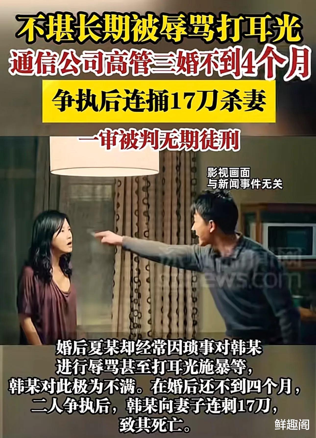 可是走到家门口过道处的时候,夏某反悔不肯上楼,反倒在楼道里不停地大声喊着“要韩某去死”。韩某的愤怒已经达到顶点,他忍无可忍,长期以来心中的怨气终于在这一刻爆发。韩某拿起水果刀向妻子夏某连续捅刺17刀后,结束了夏某的生命,离他们结婚仅有四个月。最终,韩某被南昌中级法院判处无期徒刑,受到了应有的处罚。