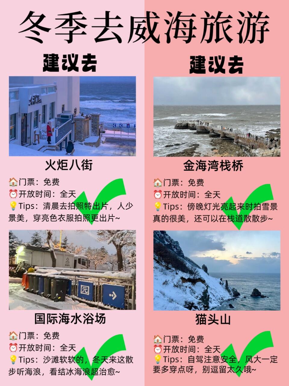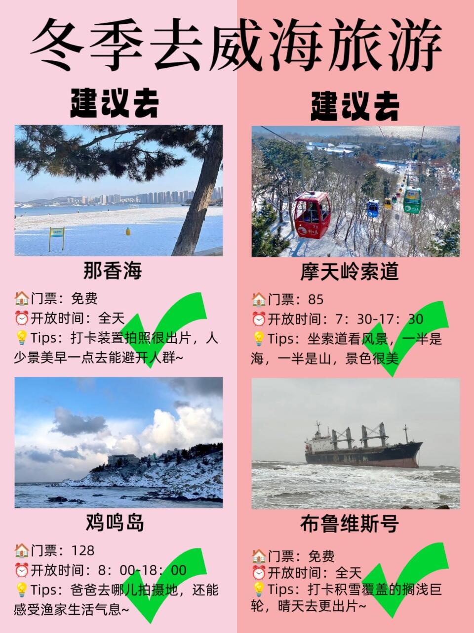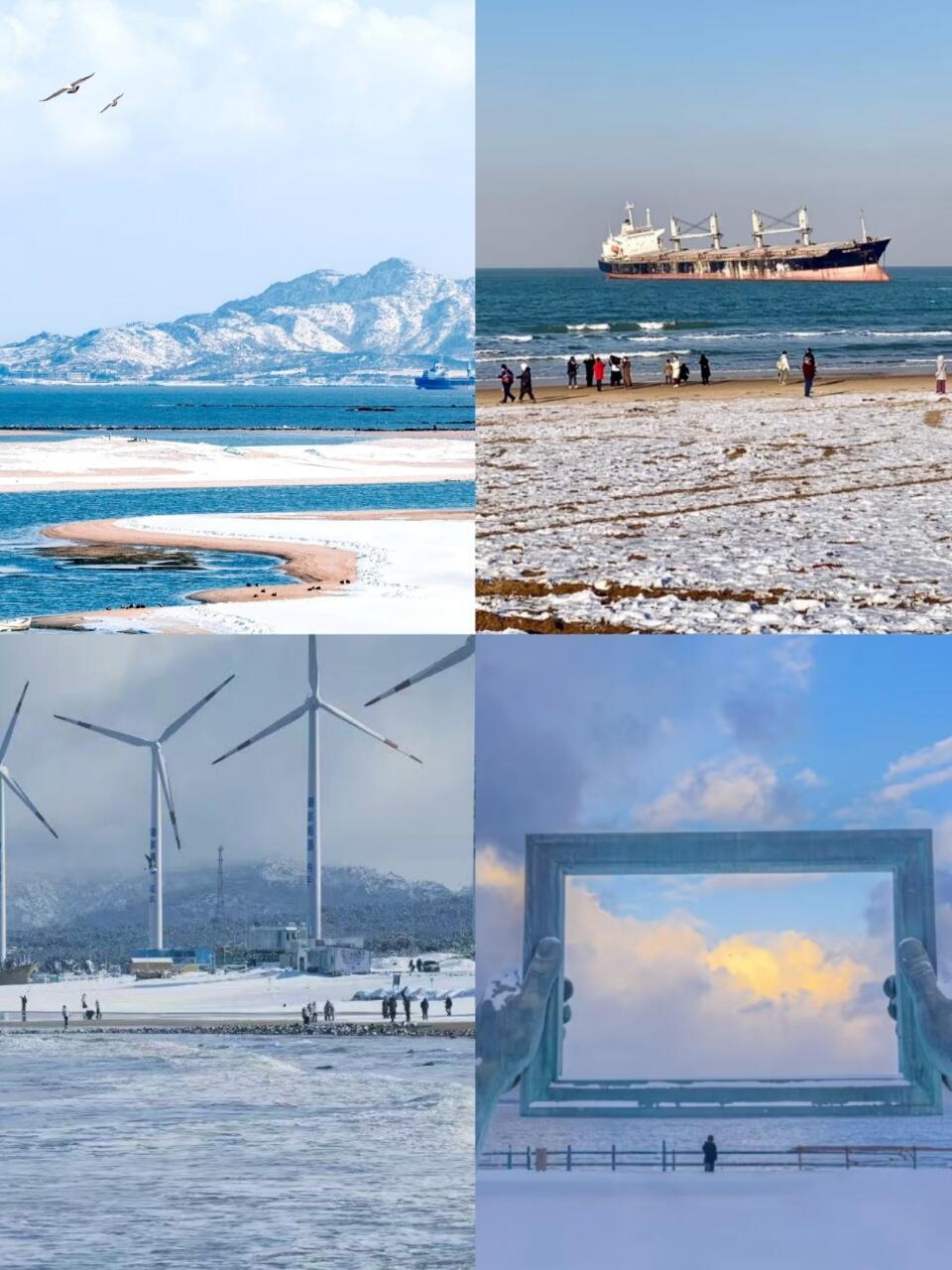 宝子们,冬天的威海真的太美啦!一下车冻的我们直哆嗦🥶,一定要多穿点,防风羽绒服、厚围巾🧣、护耳帽都准备好,雪地靴选防水防滑的,不然结冰路面走路容易摔倒~