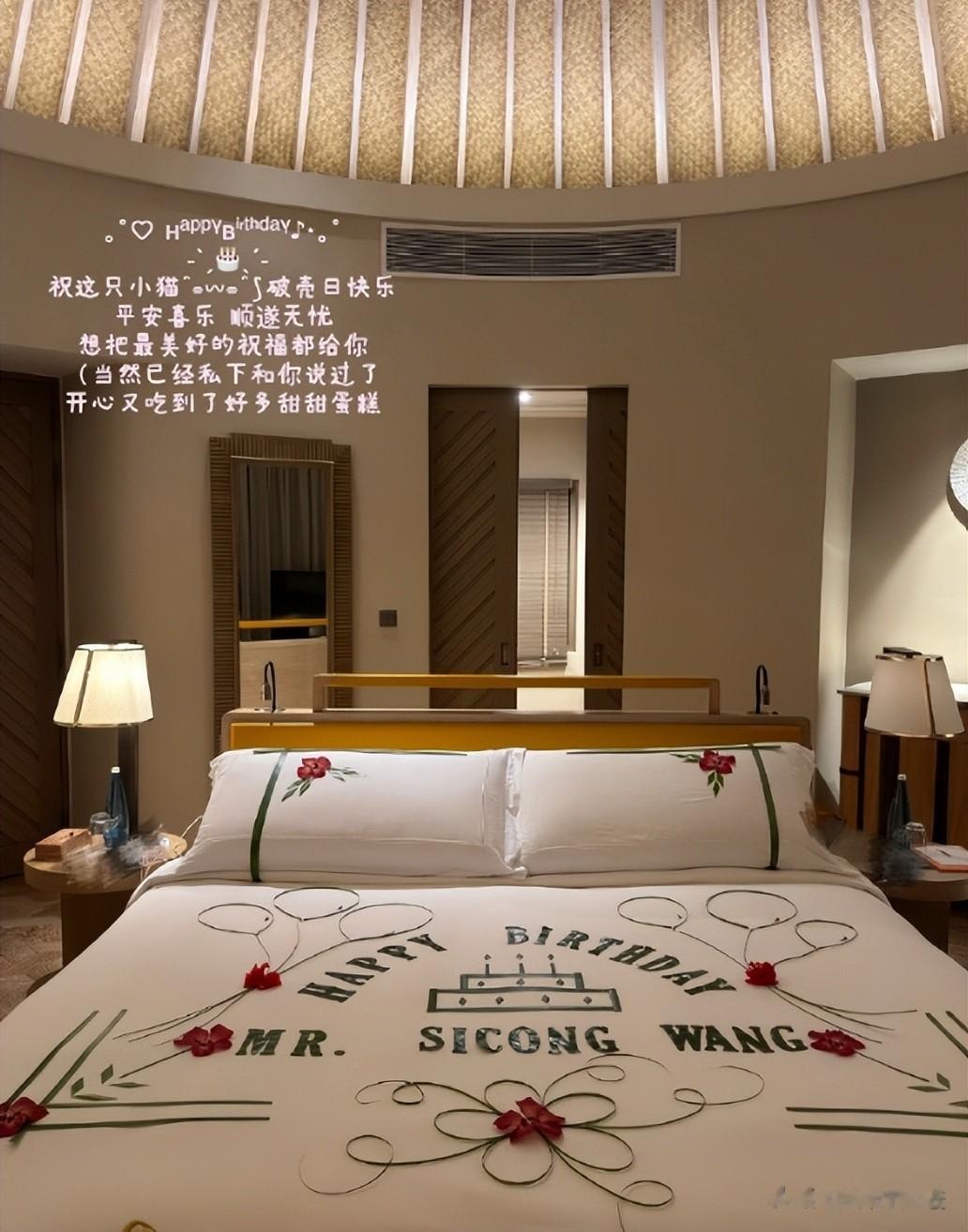 其中一张照片是酒店的大床,懒懒在上面放布置了鲜花,以及用拼音拼出的王思聪名字,看得出来是挺用心的。